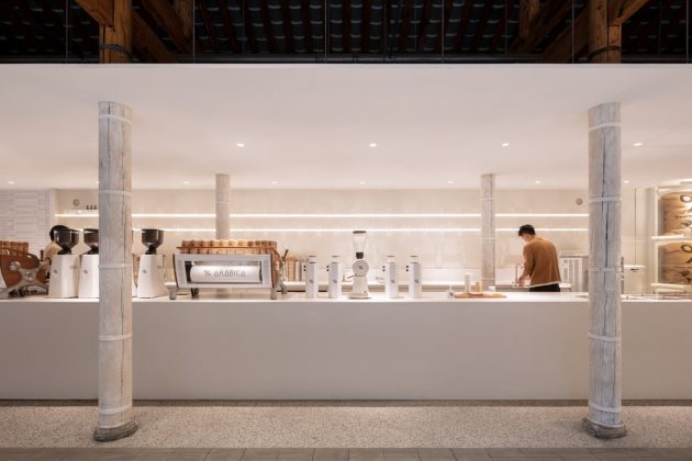 The design juxtaposes timeless textures—wood, handmade bricks, natural stone—with Arabica’s clean modern lines. This contrast embodies both Chengdu’s cultural memory and the café brand’s minimalism, creating a setting that is at once rooted and global.