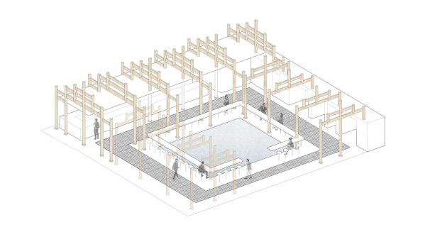 Street-like counter: Opposite the pool, a sleek white bar counter under a light eave recalls a roadside stall—enhancing the sense of urban publicness.