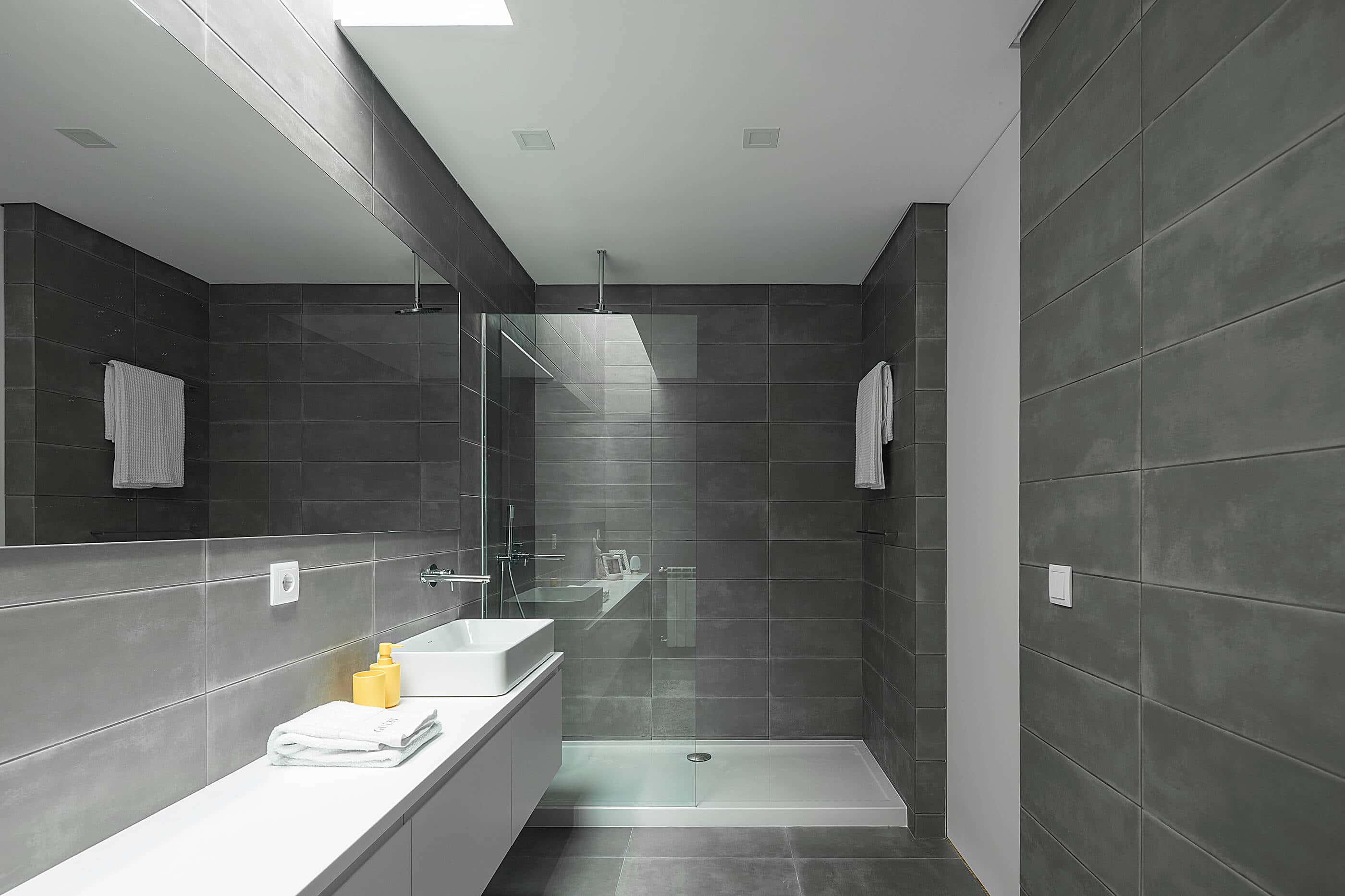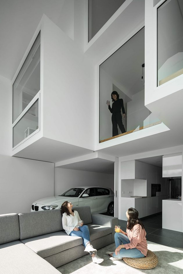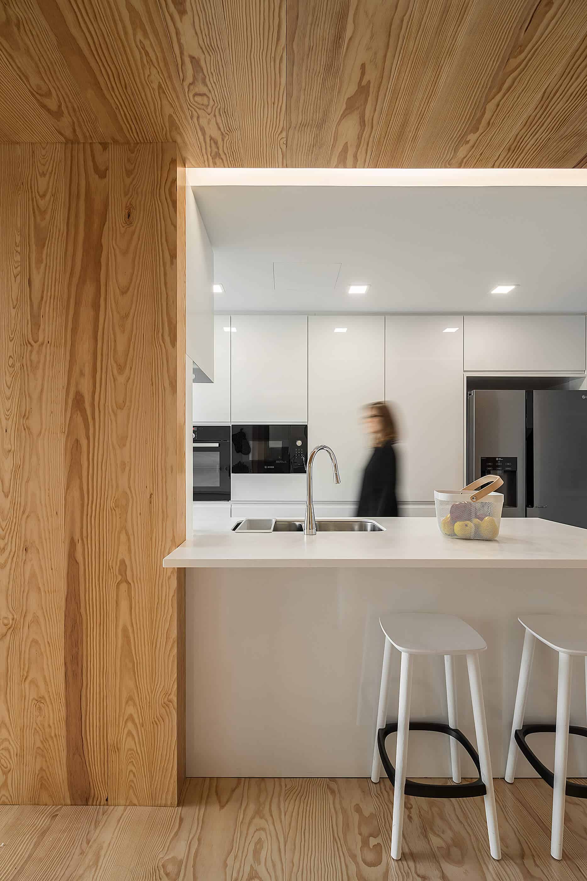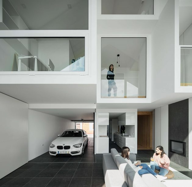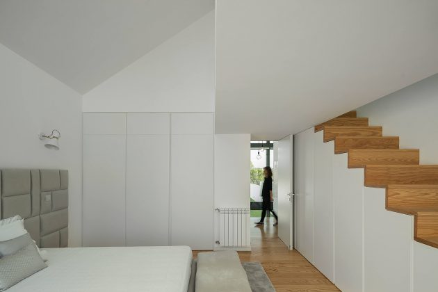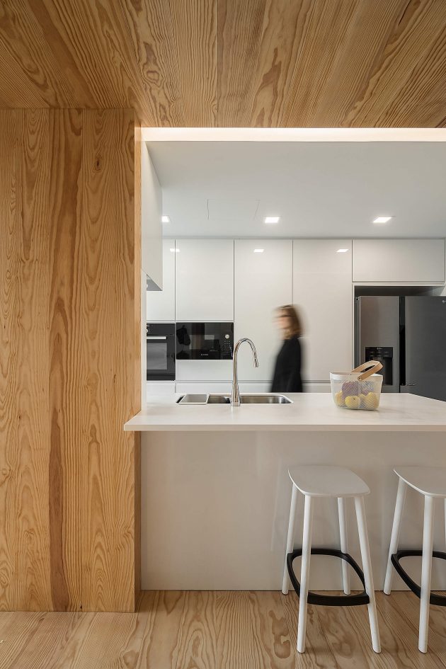 The entrance hall is a small “wooden box”, where we fell cosy and welcome, but immediately after we are marvelled by the light and the high ceiling of the living room. It was important for the architect to guarantee this process of transition from the public to the private, as well as ensuring adequate privacy in the interior, because of the maximum exposure desired.Inspired by ship containers, the volume set with which the interior is developed, creates a total height in some areas, recreating the great industrial environment of a main ship. This set of different roof heights widens the spaces and makes them more comprehensive, providing a visual relation between the various places in the house.