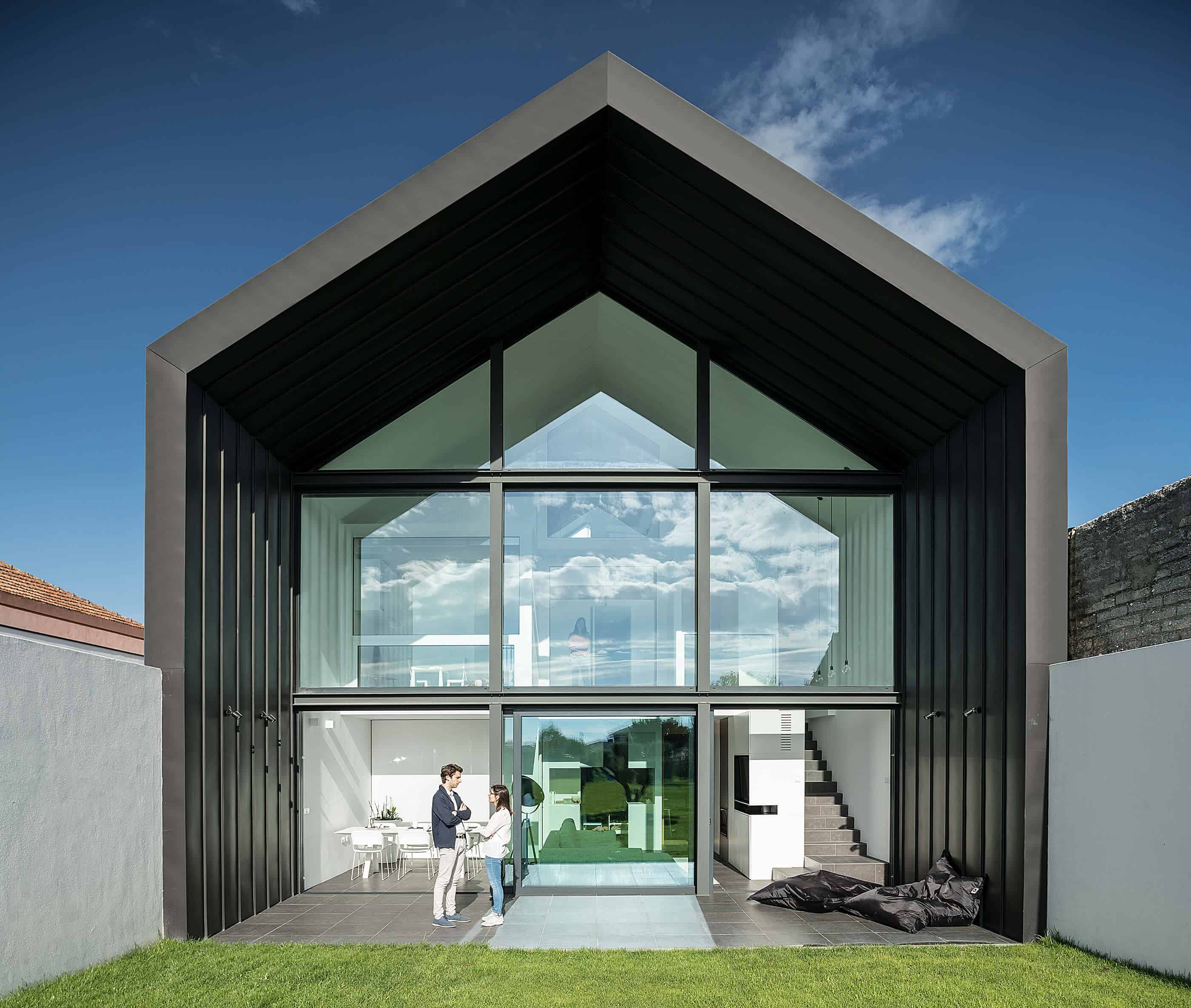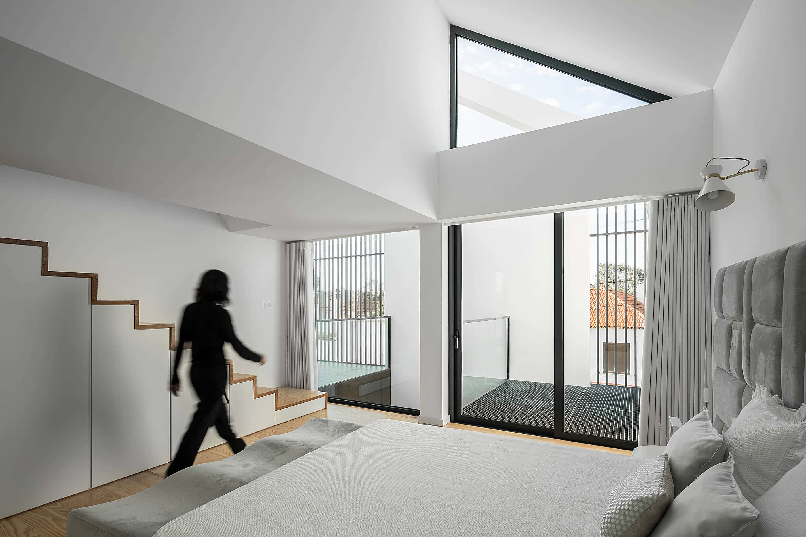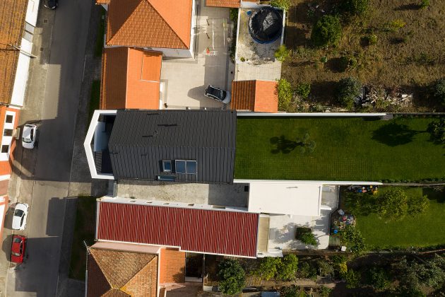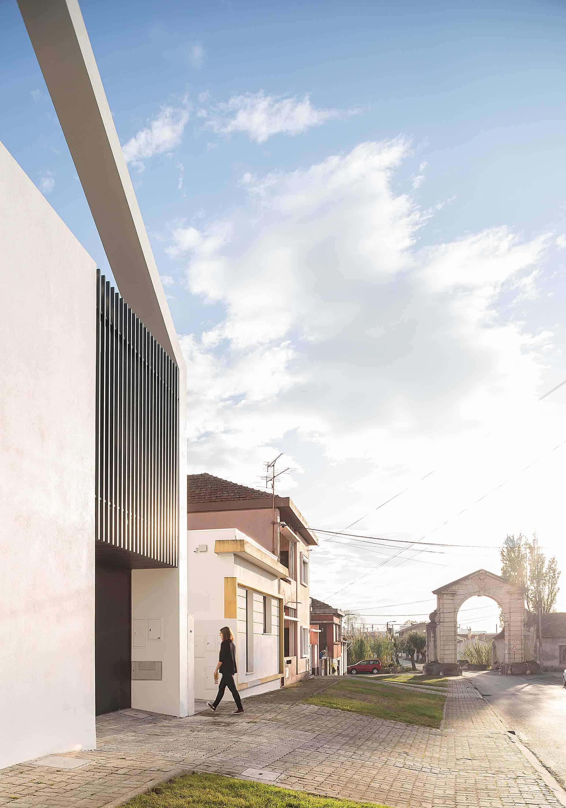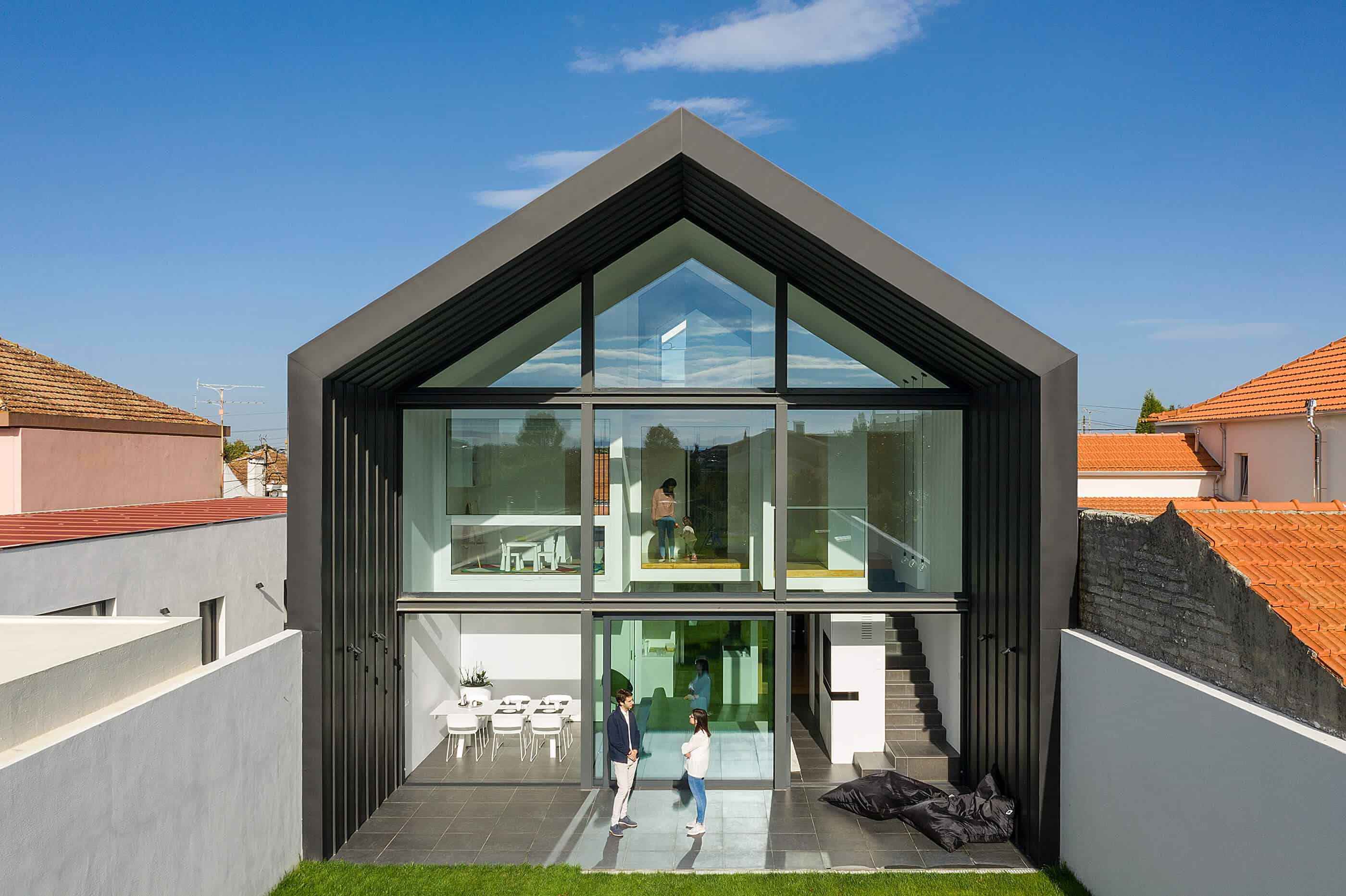 She seeks references in industrial architecture to materialize the dwelling as a uniform body, coated with metallic materials and where the interior is independent of its outer casing.The Arch House follows the continuity of the neighbour buildings, with the main facade ensuring the alignment with the consolidated pre-existence. However, it is stylized to allow the permeability of light and views, in a symbolic game of association with the presence of the Arch, which marks the entrance to the place of Vista Alegre. This debugging work creates the “crowning” of this facade, and assumes itself as a drawing of any child – My house!