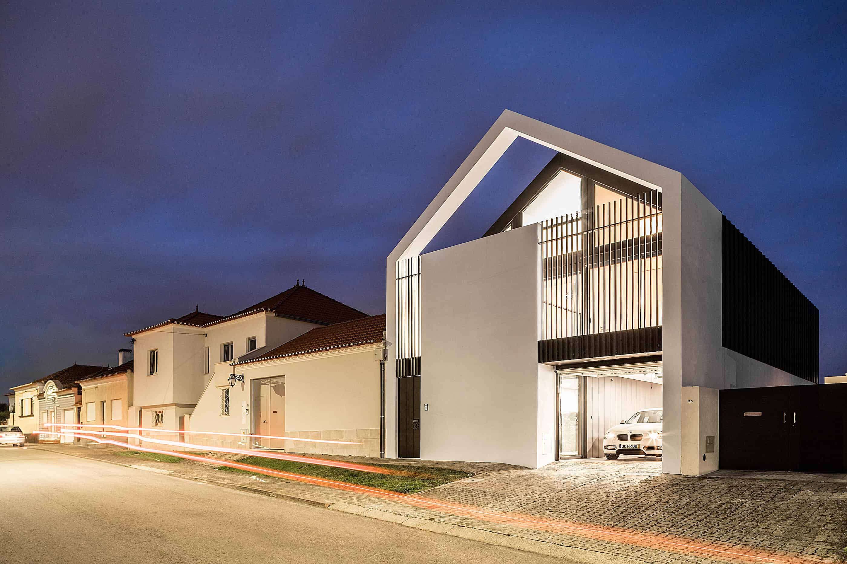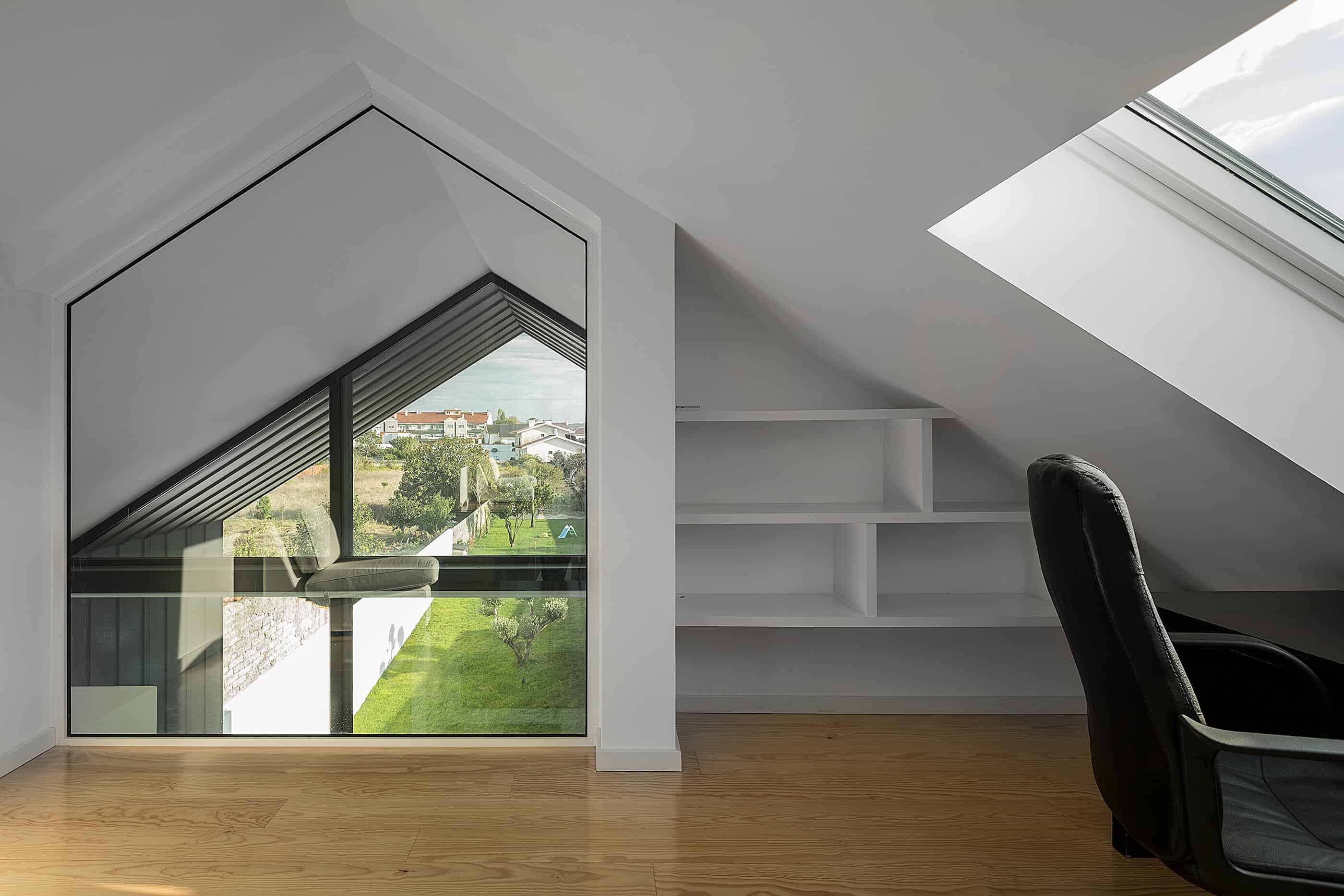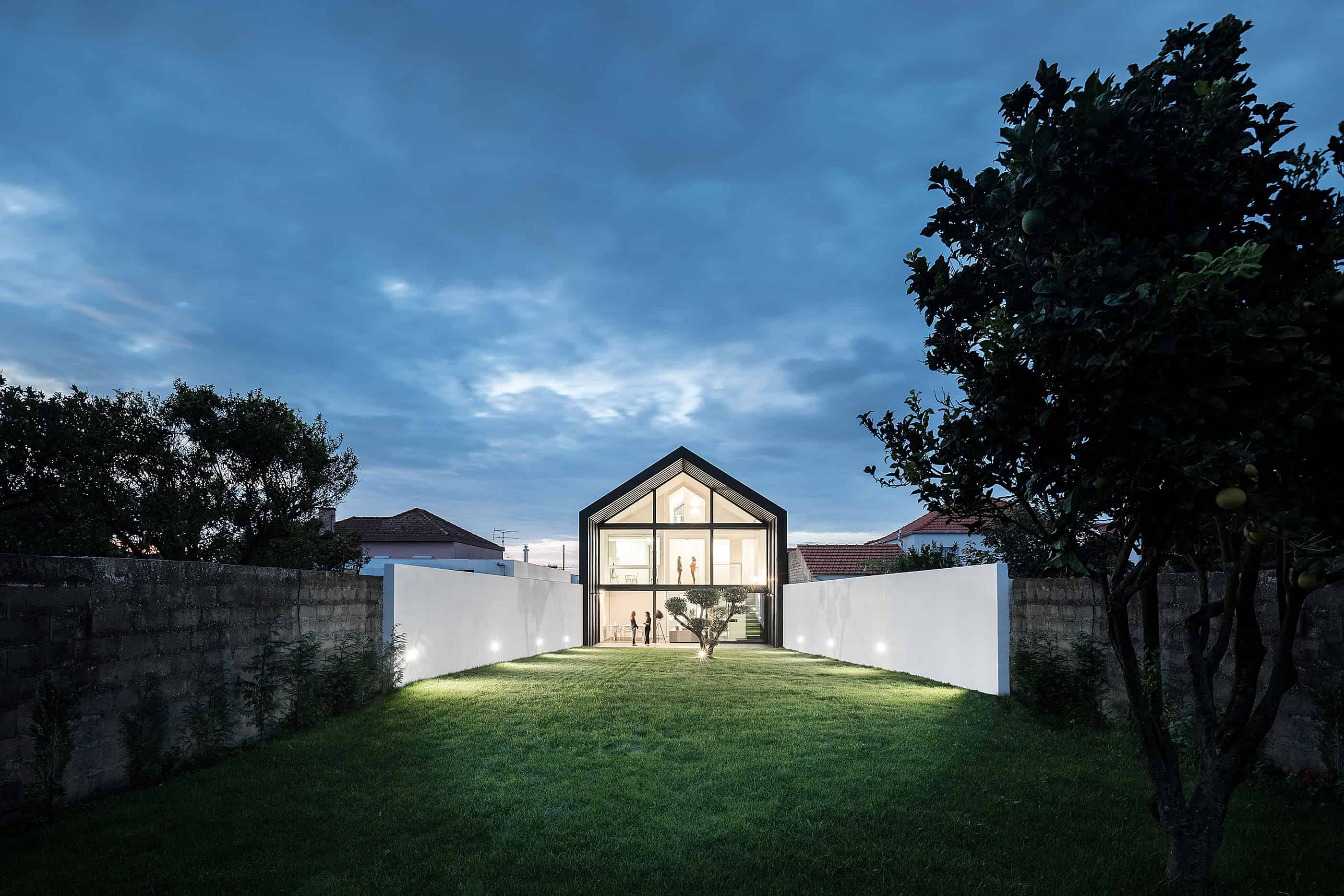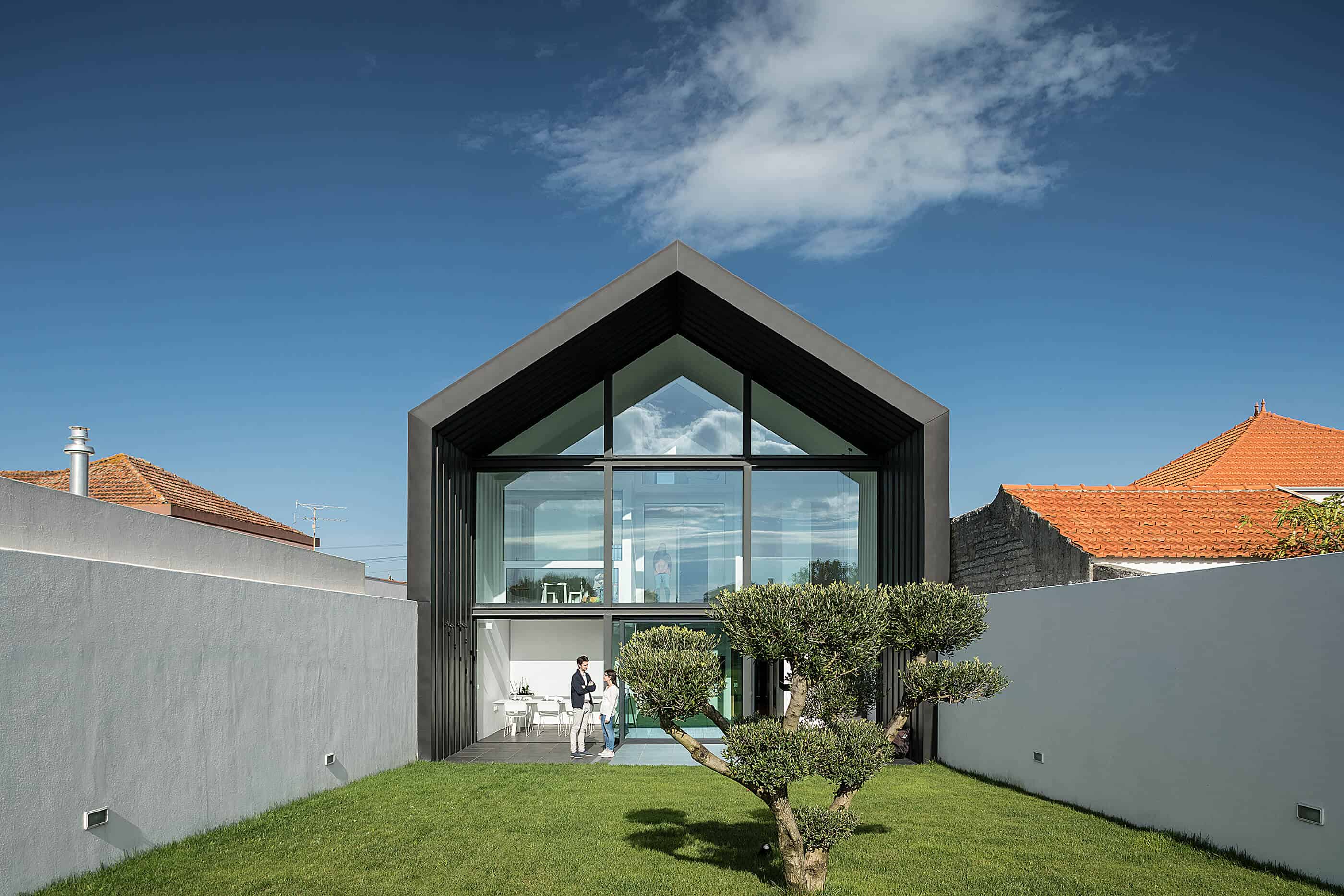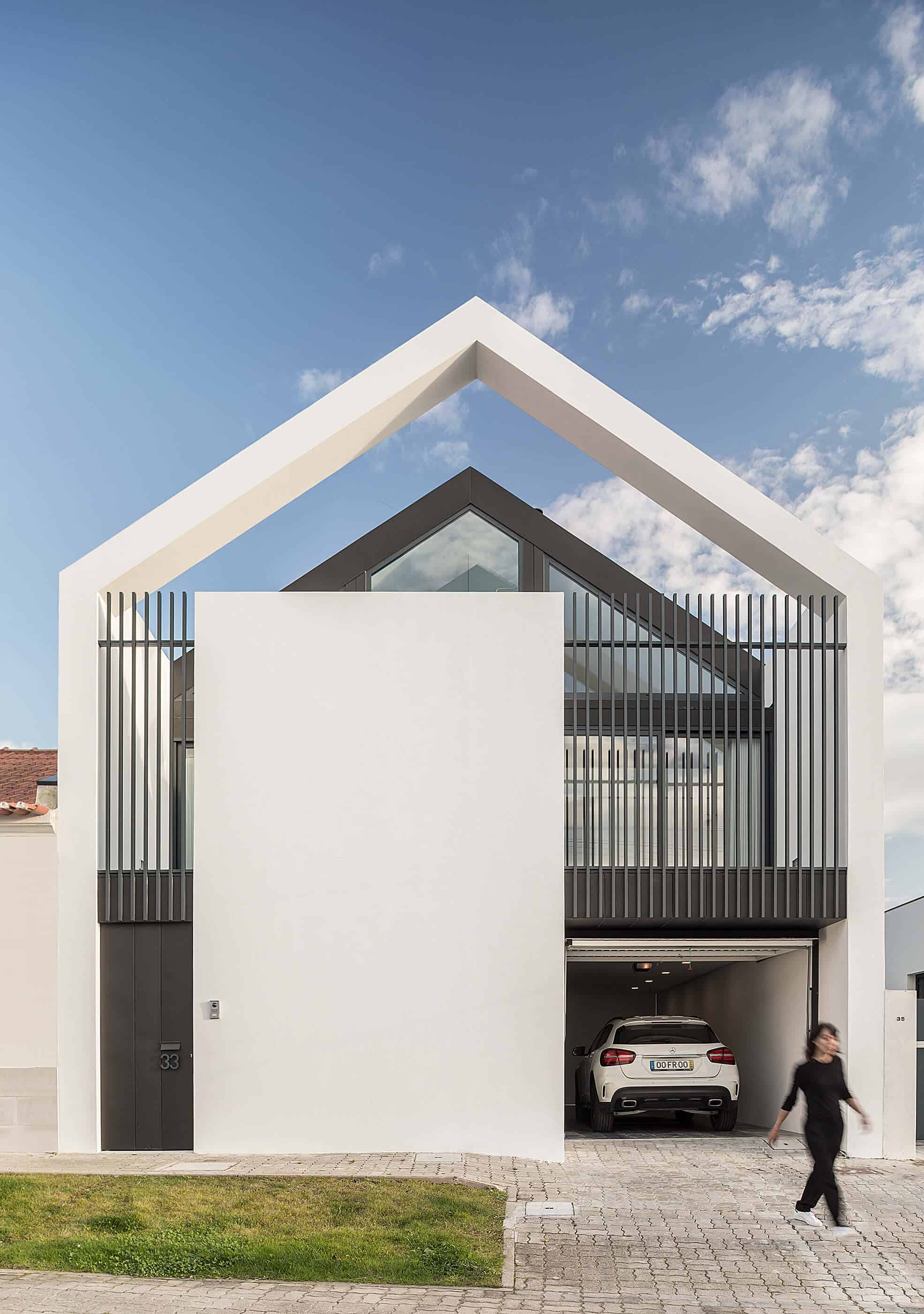 She seeks references in industrial architecture to materialize the dwelling as a uniform body, coated with metallic materials and where the interior is independent of its outer casing.The Arch House follows the continuity of the neighbour buildings, with the main facade ensuring the alignment with the consolidated pre-existence. However, it is stylized to allow the permeability of light and views, in a symbolic game of association with the presence of the Arch, which marks the entrance to the place of Vista Alegre. This debugging work creates the “crowning” of this facade, and assumes itself as a drawing of any child – My house!