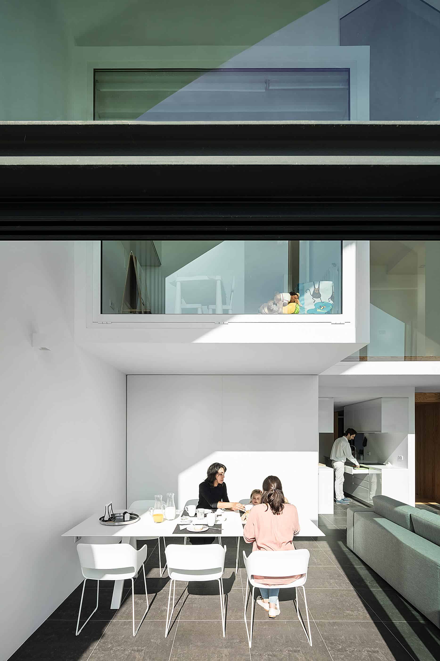 Due to construction restrictions, the basement floor designed for the atelier wasn’t built. This decision forced a global redesign but it was ensured the minimum changes to the original project of the house.The Arch House is, therefore, the combination of these three assumptions: the theatricality of the urban facade, the complexity of the pretended use versus the industrial inspiration and the limitations of the plot, that, together, makes this house a complex and unique piece of architecture!