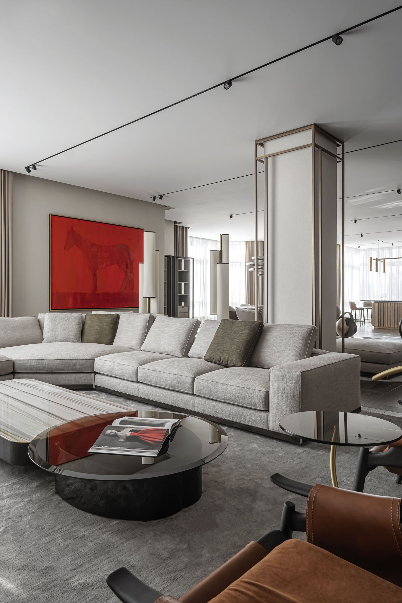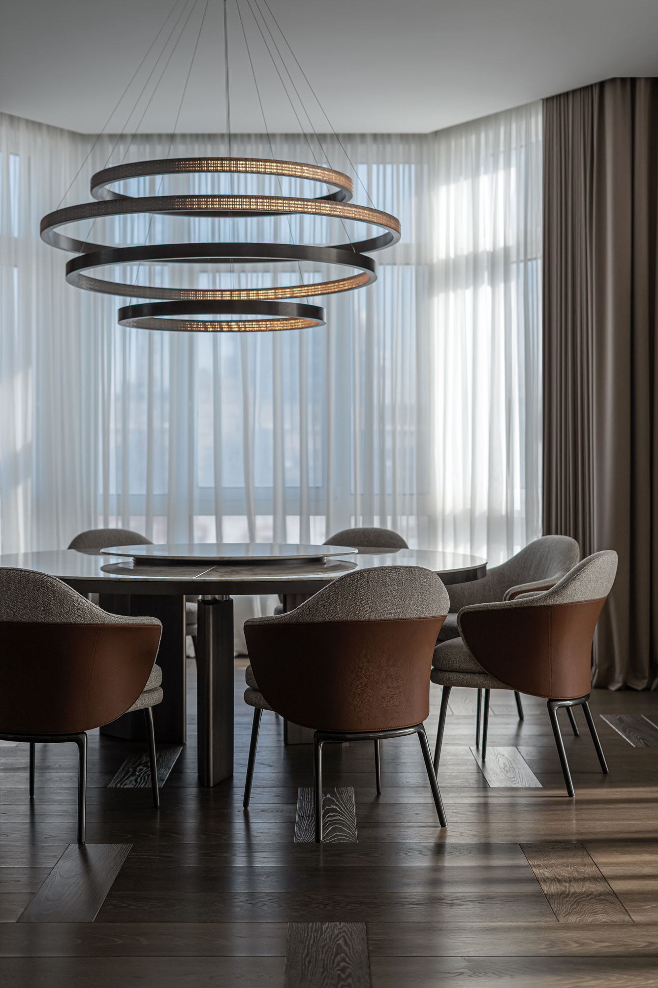 The living room of the apartment is equipped with furniture of Italian brands, but the Minotti dining table deserves special mention. It is made in the Japanese izakaya-style which assumes the sharing of dishes between all guests at the table. The composition of the dining area is completed by a custom lamp from the English brand Cameron Design House, designed in a single copy especially for the Grand Apartment project.