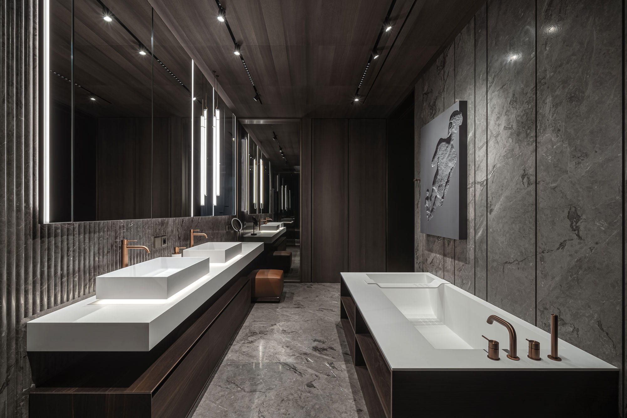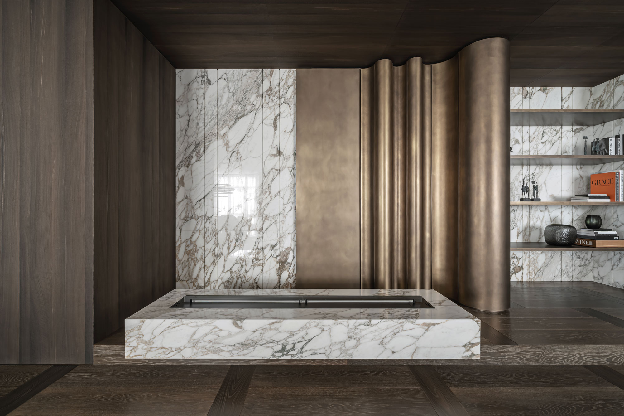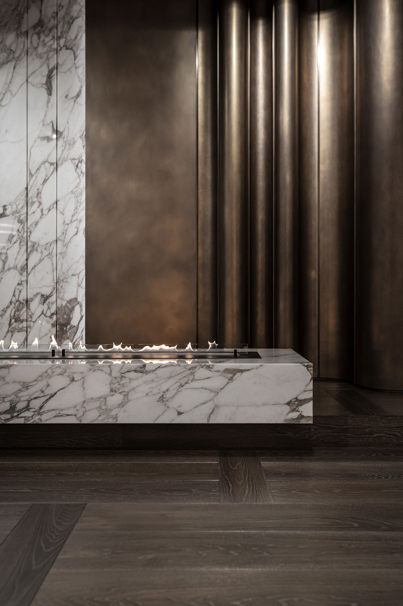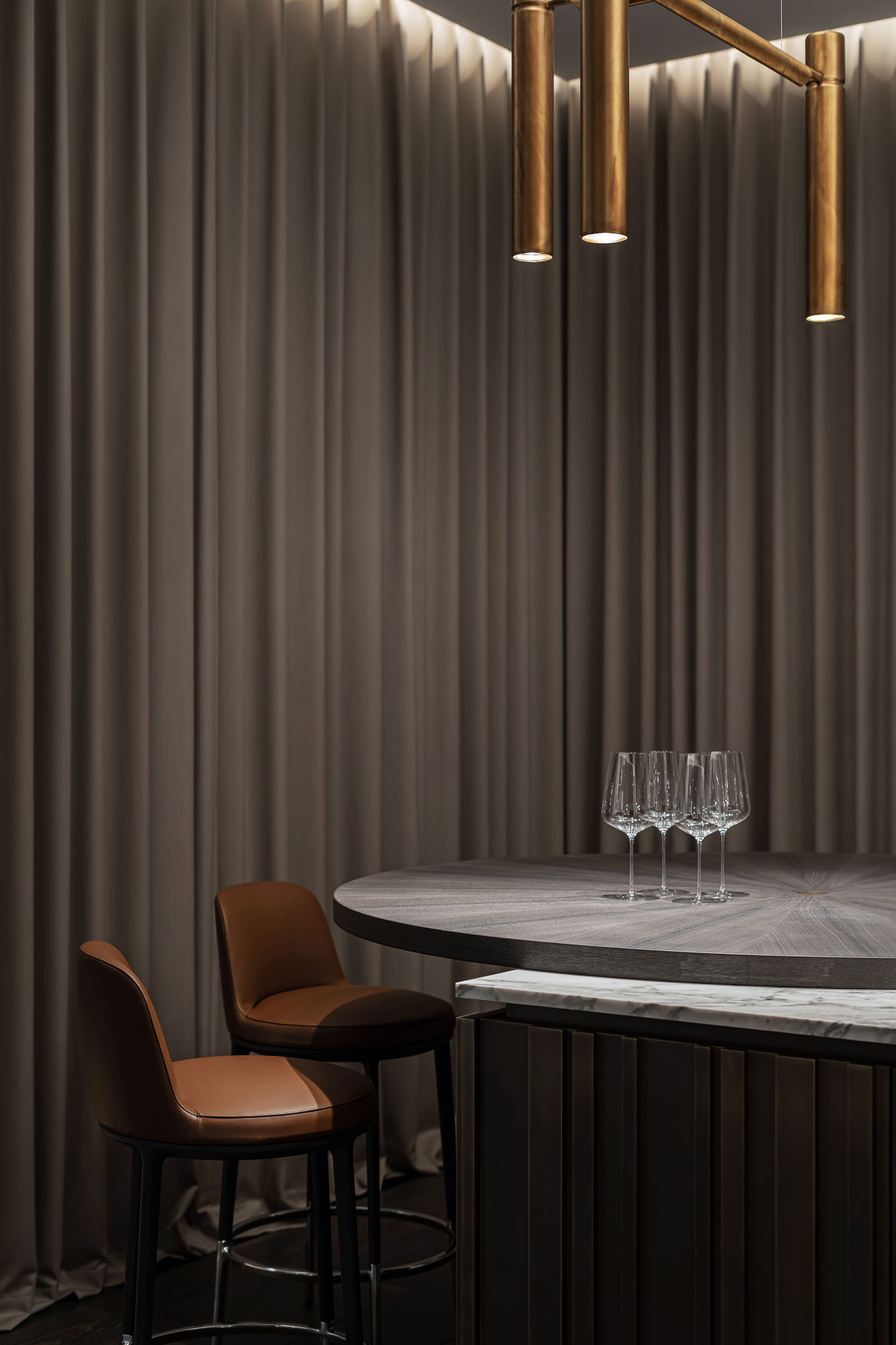 Elements of the kitchen area are traditionally made of natural stone according to YODEZEEN’s schemes. The marble island is framed with brass walls and is equipped to be accompanied by high B&B bar stools to create a more informal image of the kitchen. Henge’s Tubular Horizontal light composition illuminates the stone island and can be adjusted to the specific mood and atmosphere.