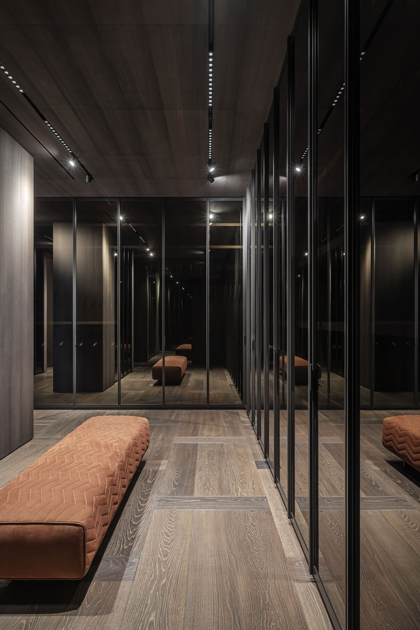 The only notable door in this apartment is a heavy brass front door, behind massive dimensions of which opens a perfectly designed hallway, not overloaded with any superfluous elements. At the entrance, there is a custom console made of wood and glass, as if it is floating in the air, and a small ottoman by the Minotti brand as the completion of the concept of a guest wardrobe on the opposite. All technical rooms, the entrance to the guest bathroom, as well as additional storage space, are cleverly hidden in veneer wall panels.