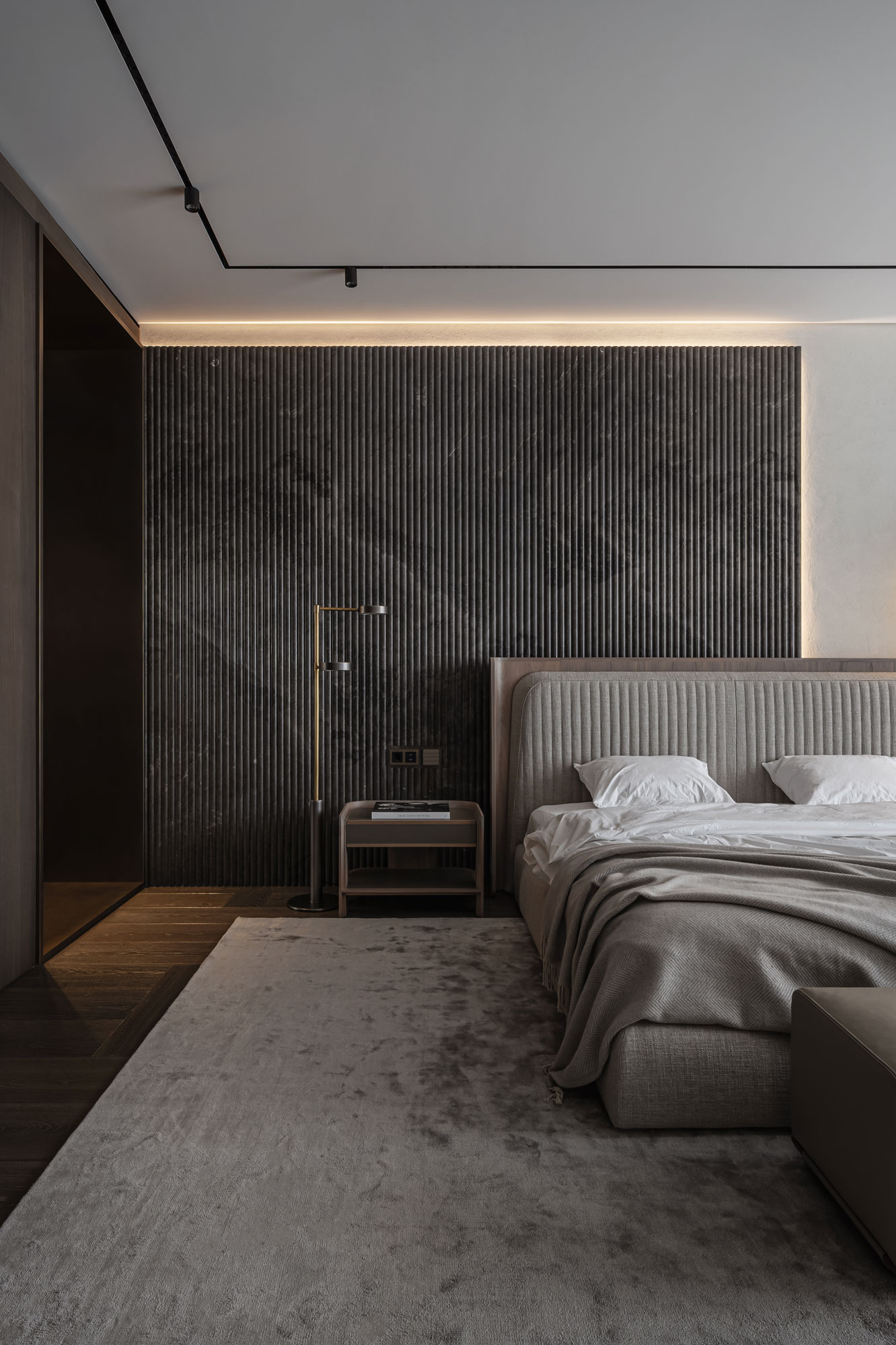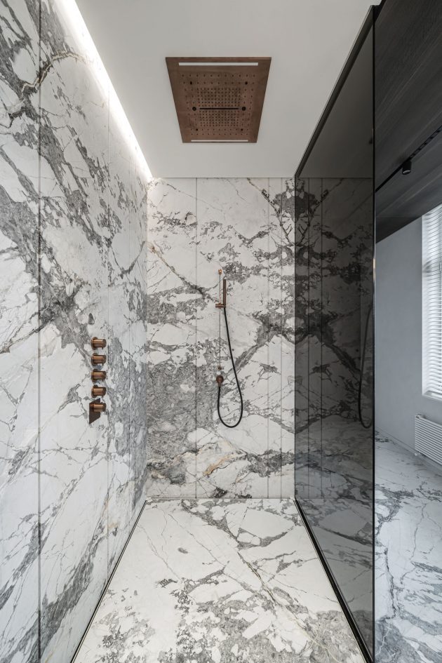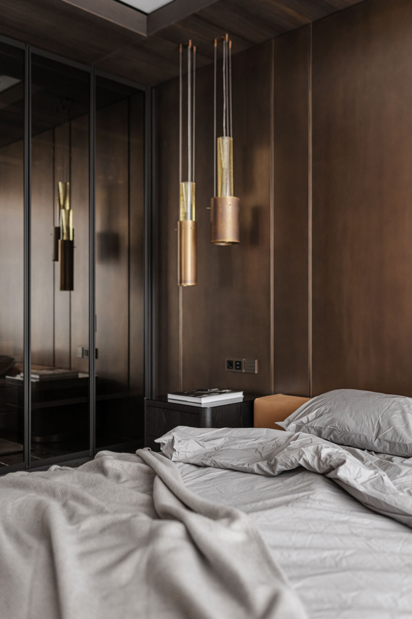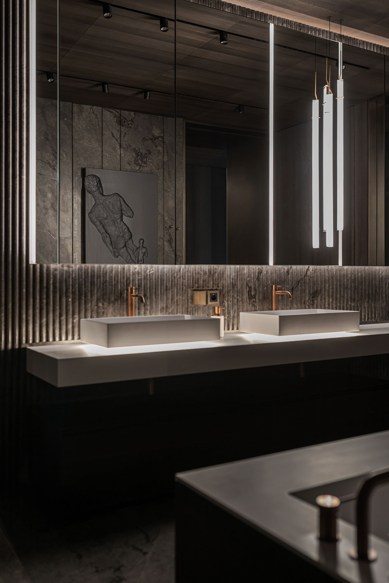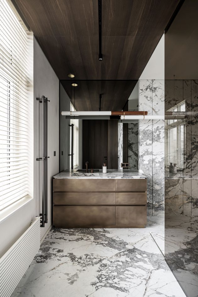 The recreation areas also have a zoning technique, where walls or floors merge into each other and support the overall concept of the space. For example, a common stone wall has been designed in the master bedroom and the bathroom, hinting at the unified concept of the two spaces. Dark brown veneer turning into bronze-burgundy brass, stone wall combined with a metal, dark palette of the chamber bathroom, which is extended in the master bedroom — if you walk through these apartments, the connection is obvious. Each new element is a visual continuation of the previous one, and it creates a subtle but perceptible bond between the premises. “We wanted to pay tribute to the architecture of the interior in all its magnificent details and at the same time preserve the integrity of the entire living space. All those principles that we love in the exterior, we have embodied inside, without neglecting the comfort,” — summed up Artem Zverev.