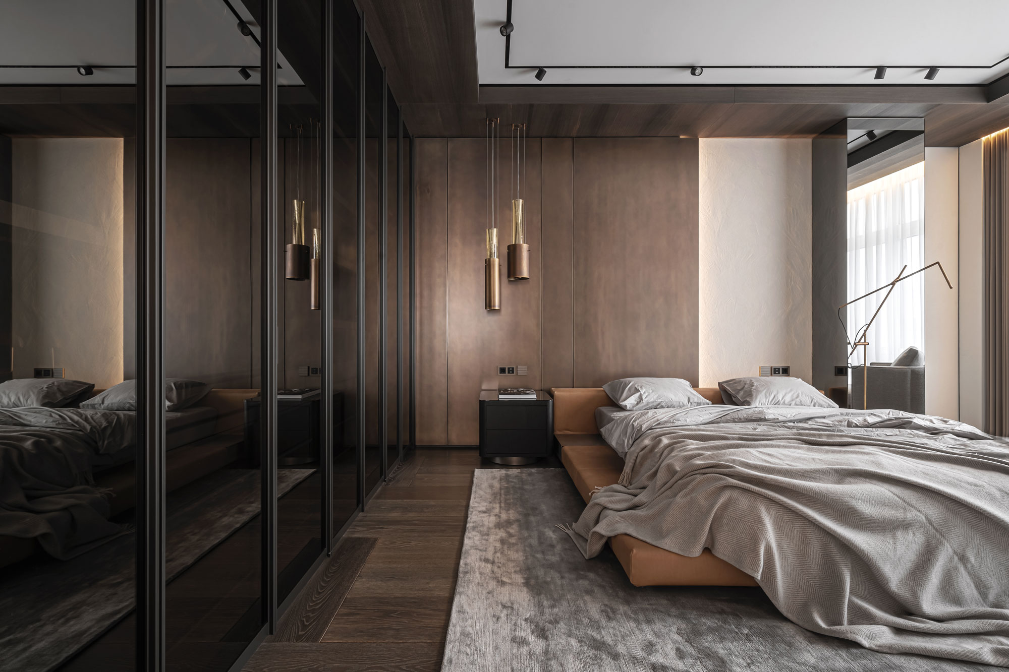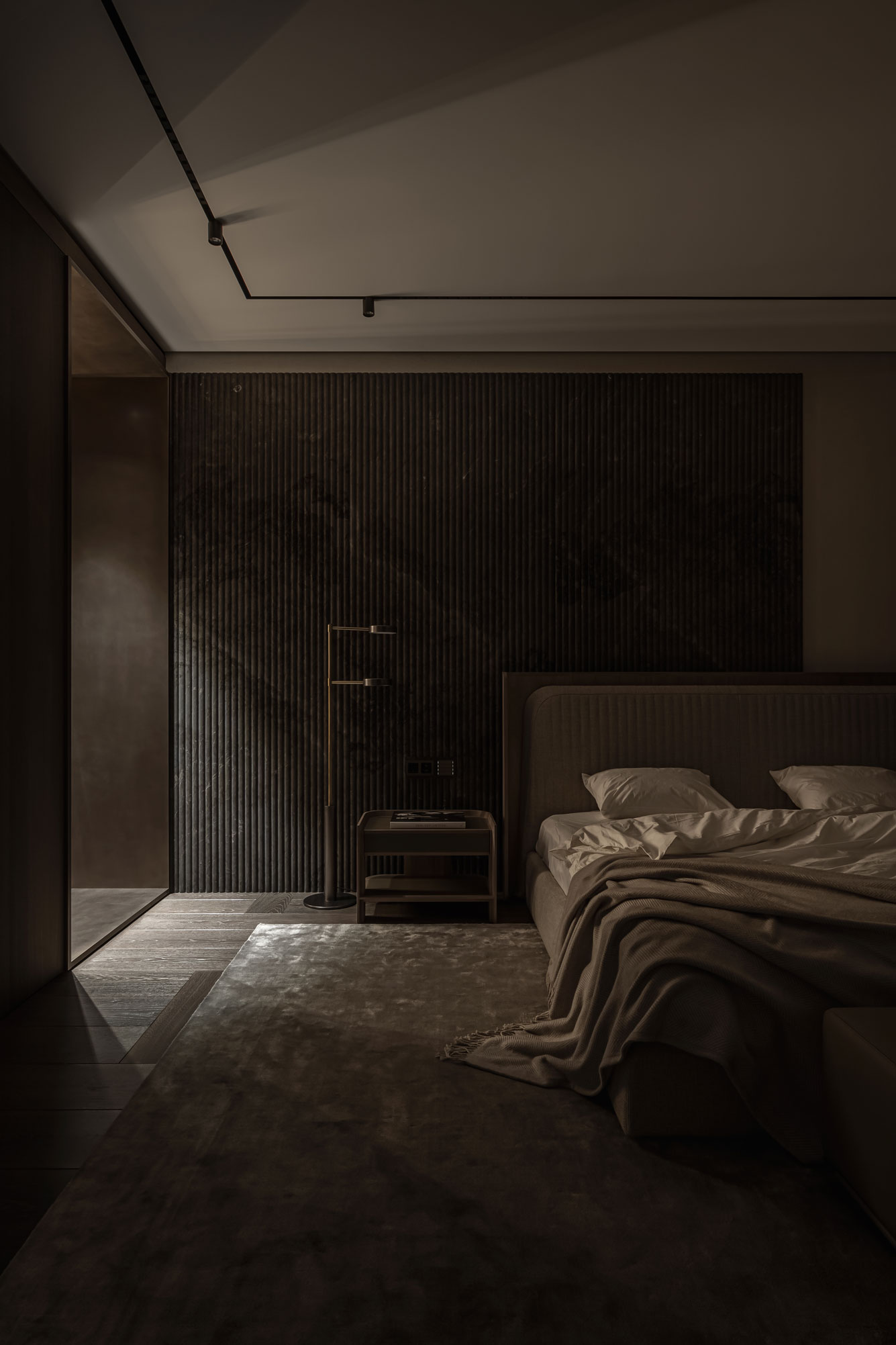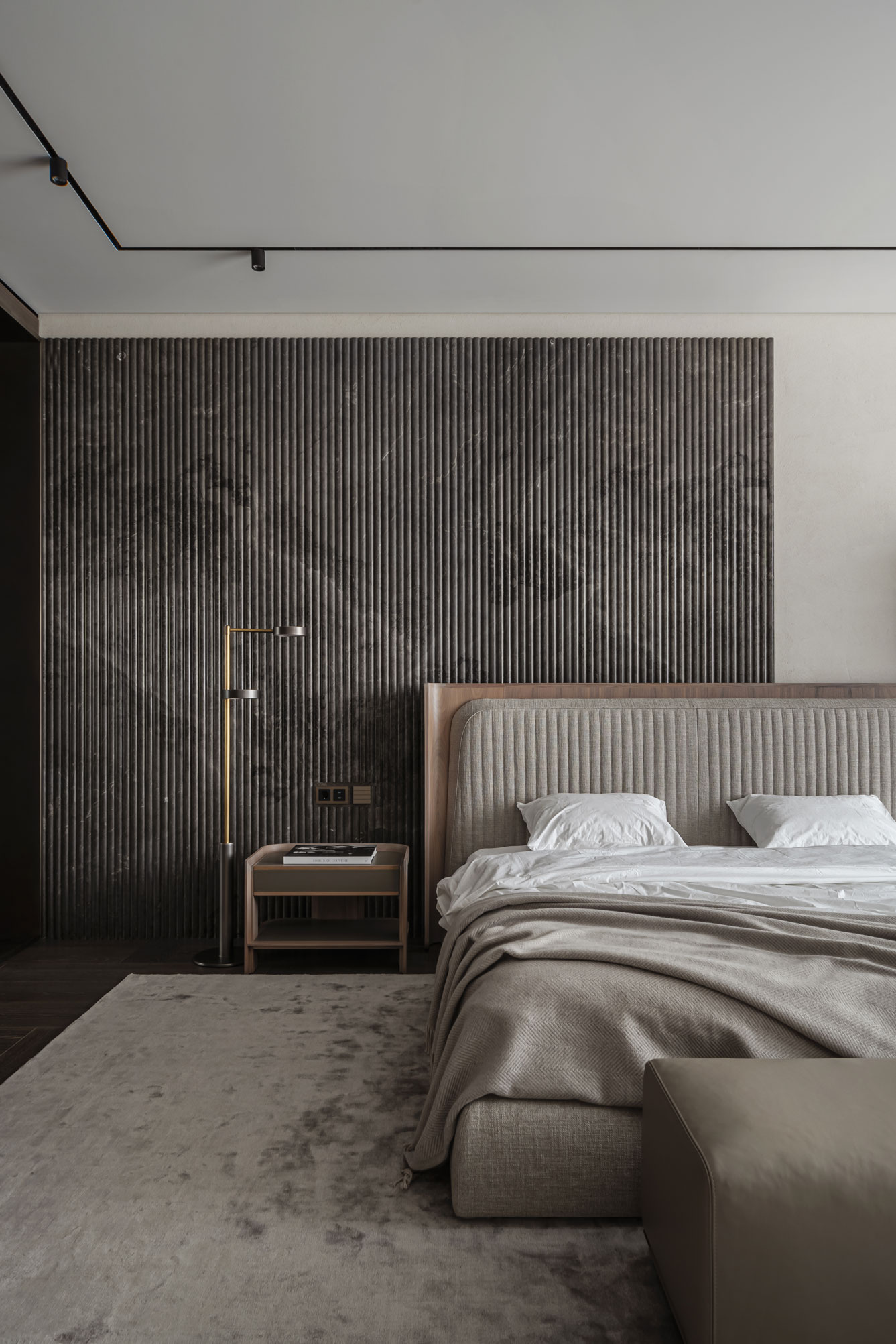 The recreation areas also have a zoning technique, where walls or floors merge into each other and support the overall concept of the space. For example, a common stone wall has been designed in the master bedroom and the bathroom, hinting at the unified concept of the two spaces. Dark brown veneer turning into bronze-burgundy brass, stone wall combined with a metal, dark palette of the chamber bathroom, which is extended in the master bedroom — if you walk through these apartments, the connection is obvious. Each new element is a visual continuation of the previous one, and it creates a subtle but perceptible bond between the premises. “We wanted to pay tribute to the architecture of the interior in all its magnificent details and at the same time preserve the integrity of the entire living space. All those principles that we love in the exterior, we have embodied inside, without neglecting the comfort,” — summed up Artem Zverev.