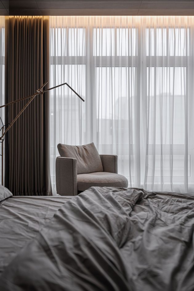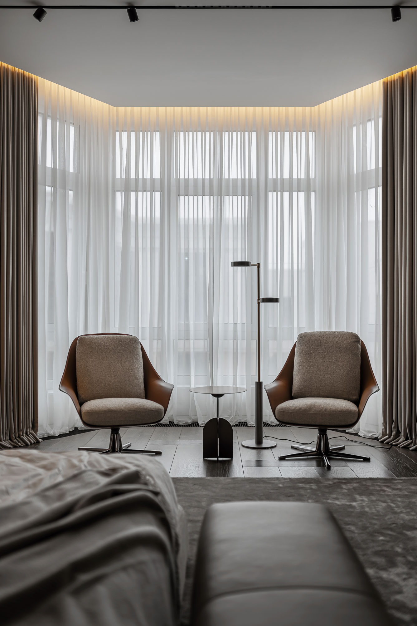 The entire area of the apartment can be conditionally divided into two separate spaces: common areas and a master zone. In the first part, there is a combined kitchen and living room, which also consists of two sub-zones: a lounge area opposite the fireplace and an area for receiving guests. The master zone, in turn, is somewhat hidden from prying eyes behind a door that smoothly continues the surface of the wall. The door is so aesthetically inscribed in the space that, if there were no handle on the plane surface, it would be difficult to understand that there is a full-fledged room behind it. It consists of a dressing room and a master bedroom with a private bathroom, and it is adjoined by another room — a guest bedroom, which is designed so that later it could be converted into a nursery.