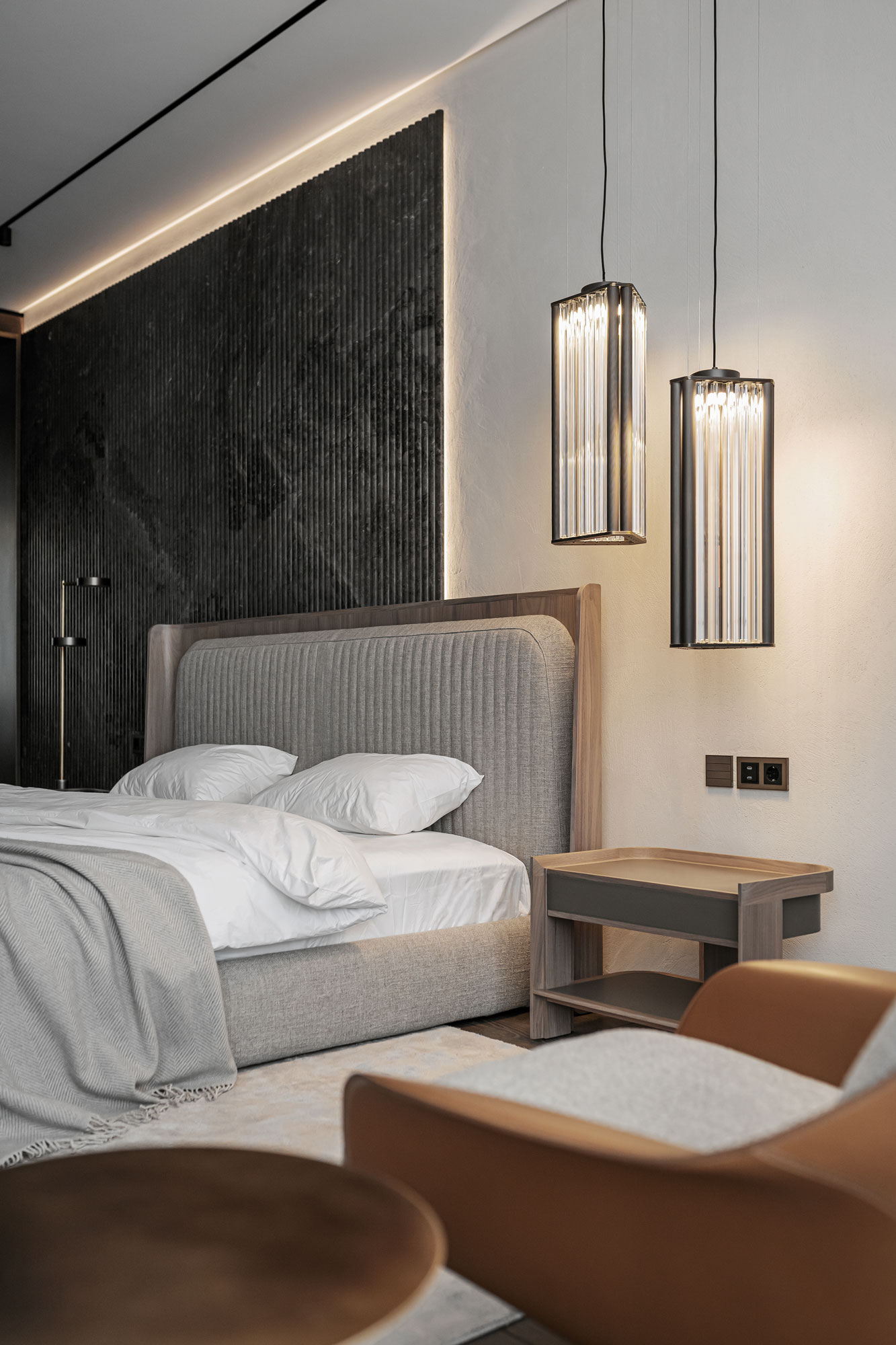 The overall concept of the space was developed taking into account the principles of combining elements and textures, which together would create an optical harmony and perfection. Anyone can notice, or rather not notice, not a single visible seam or negligent matching of materials in this architectural interior. Stone, wood, and metal are connected, smoothly bending, or even look as if they were a single whole organism. This interior has many straight lines that smoothly flow into wave-like shapes, and the absence of sharp corners is additionally emphasized by the rounded shape of the furniture.