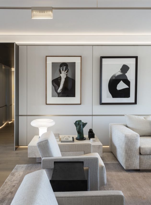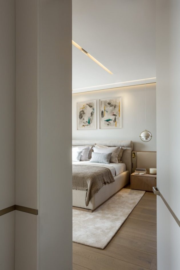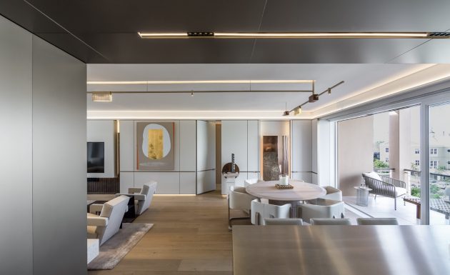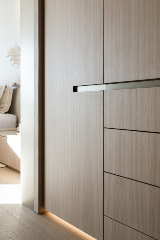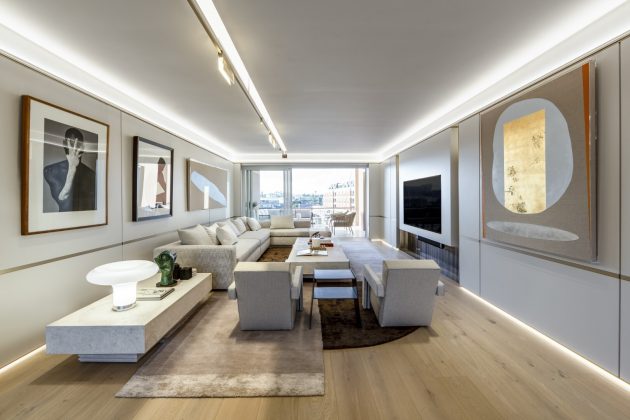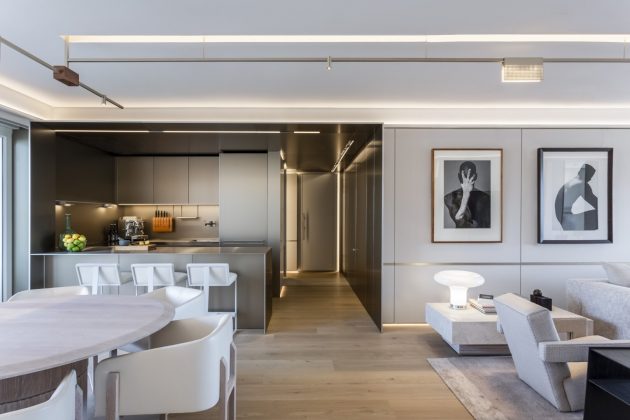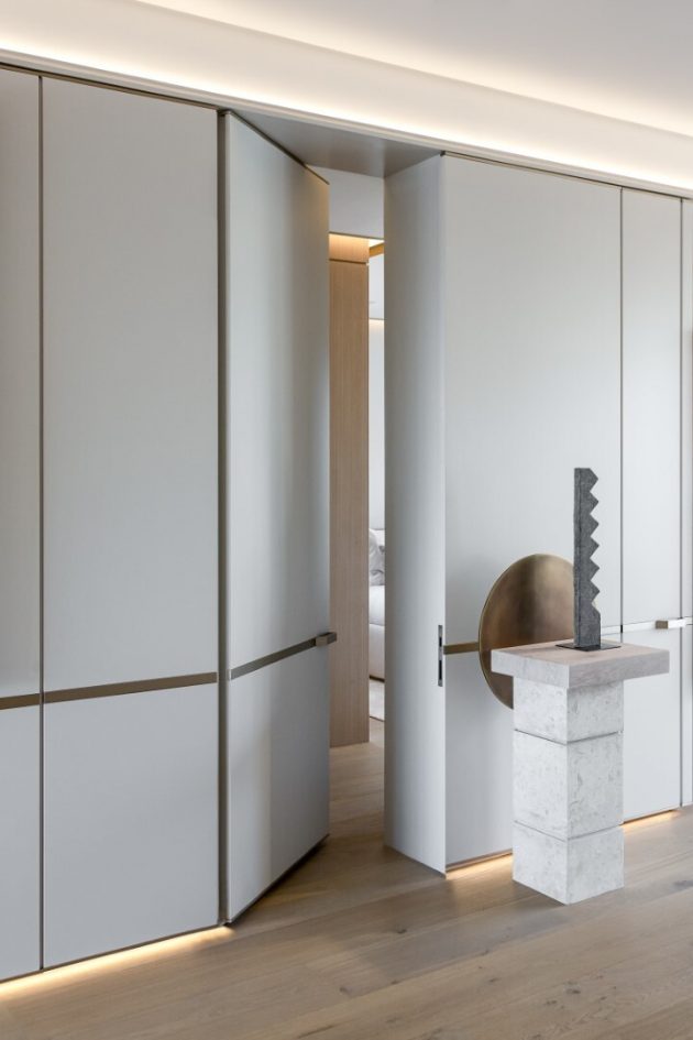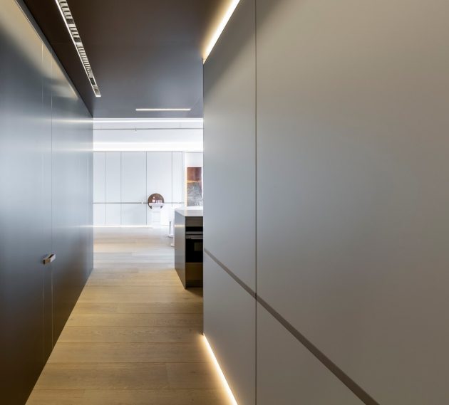 The client brief specified a strictly minimalistic approach. With the long rectangular shape of the apartment in mind, ARRCC opted to create a unified inner shell rather than a series of separate rooms. Integrated cabinetry makes it possible to conceal storage and present sleek, uncluttered surfaces throughout the apartment. At the same time, this approach created opportunities for ARRCC to redefine the interior architecture with variations in scale and volume, subtly sculpting into the living spaces to define distinct areas within the larger open-plan space.