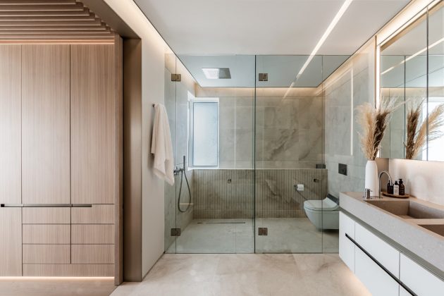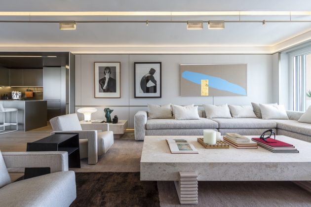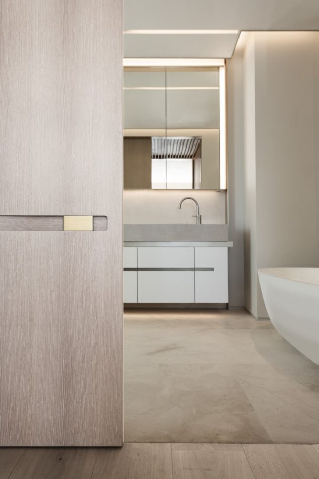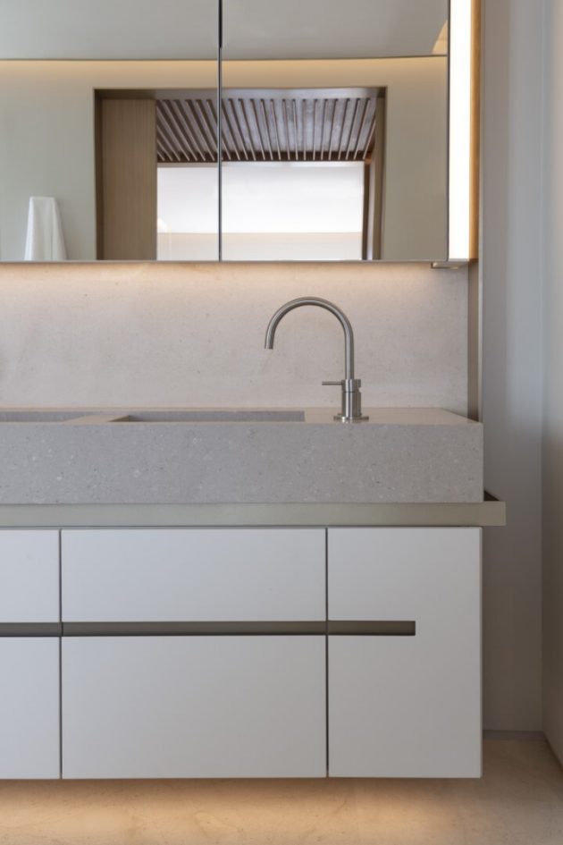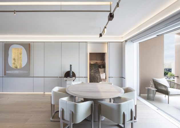 From the ribbed marble finish on the TV unit and the fluting on the base of the dining room table to the chamfered edge of the tabletop, there is a sensory layering that does not impose on the clean, calm character of the minimalism. The apartment’s sense of serenity is maintained through a deceptively simple limited material palette, which becomes satisfyingly apparent only with familiarity and time.