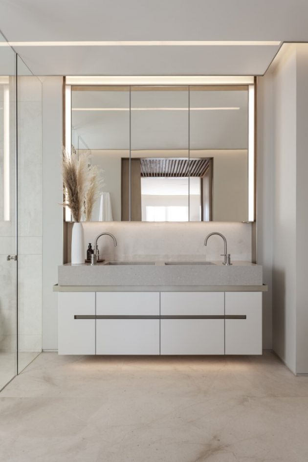 Perhaps the most clearly legible of these is the champagne aluminium-clad kitchen, which appears as a unified insertion within the larger white interior. Similarly defined volumes, however, have been created for the dining and lounge areas. This approach has been reprised using different materials in different areas in the apartment: joinery in the living space and sandstone in the bathrooms, for example, while maintaining their monolithic appearance. The transitional spaces between rooms are conceptualised as aesthetic ‘palate cleansers’, using variations in materials, texture and pattern.
