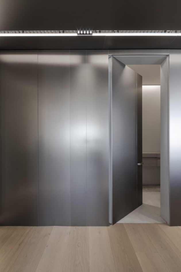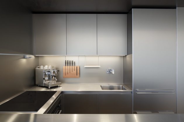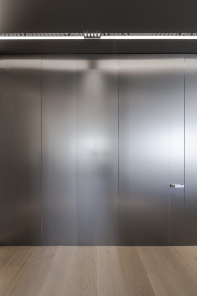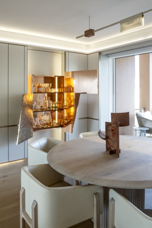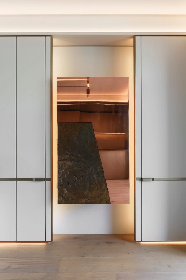The bespoke drinks cabinet, like the feature light fitting, holds a symbolic key to the apartment’s design philosophy. Its asymmetrical doors contrast a purely minimalist mirrored surface with a heavily hand-worked, pitted and patinated metal door. Its complex texture expresses the level of detailing that goes into the creation of minimalism, which only properly reveals its nature when you interact with it.