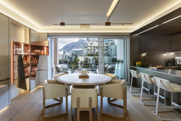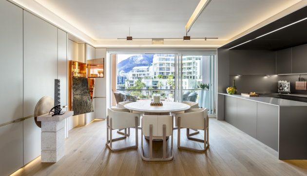 Other significant cultural and geographical markers include views overlooking the marina on one side of the apartment and natural landmarks such as Devil’s Peak (part of the city’s iconic Table Mountain) on the other. Inevitably, these contextual prompts flavoured ARRCC and OKHA’s approach to the interiors.