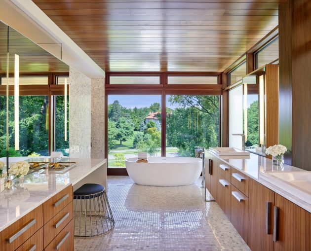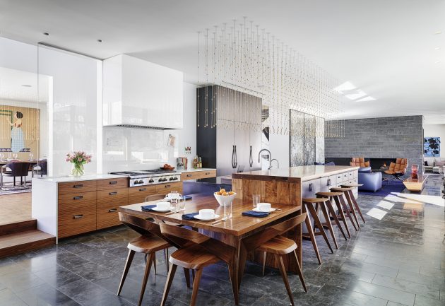 The main level is clad in limestone and contains the living spaces – the living room, kitchen, dining room, and his and her offices. Five upper level bedrooms – for the couple, their two children, and two lucky guests – cantilever dramatically. They take the form of cedar-wrapped boxes with expansive wood windows screened by aluminum louvers.