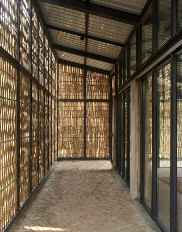A refined material palette underscores the project’s dual nature: resilient yet lightweight, humble yet intentional. Steel framework supports soaring glass façades; bamboo weave panels filter light and shade; concrete stumps, older structural elements, remain visible as part of the story.