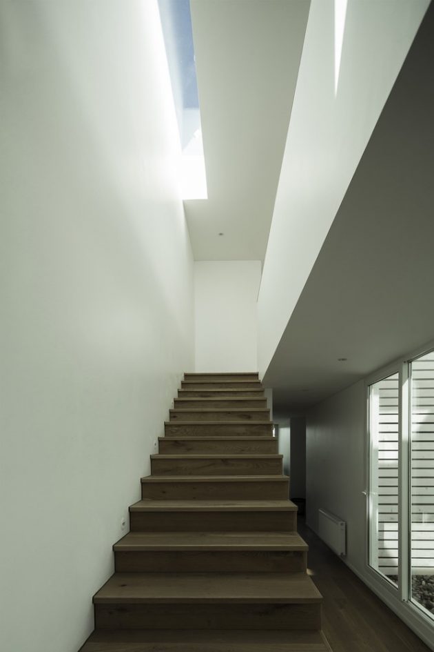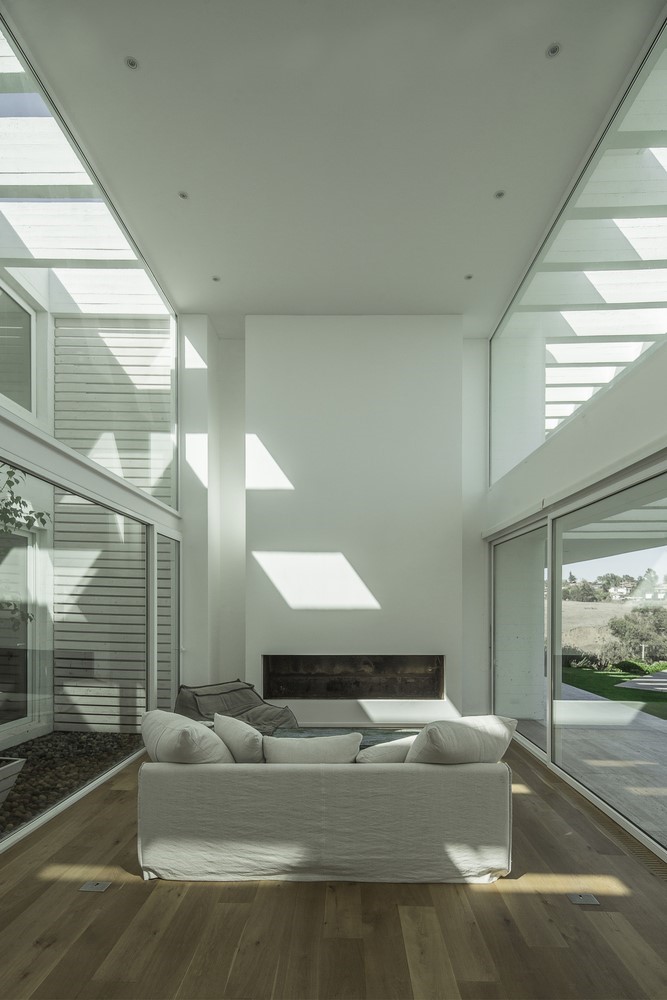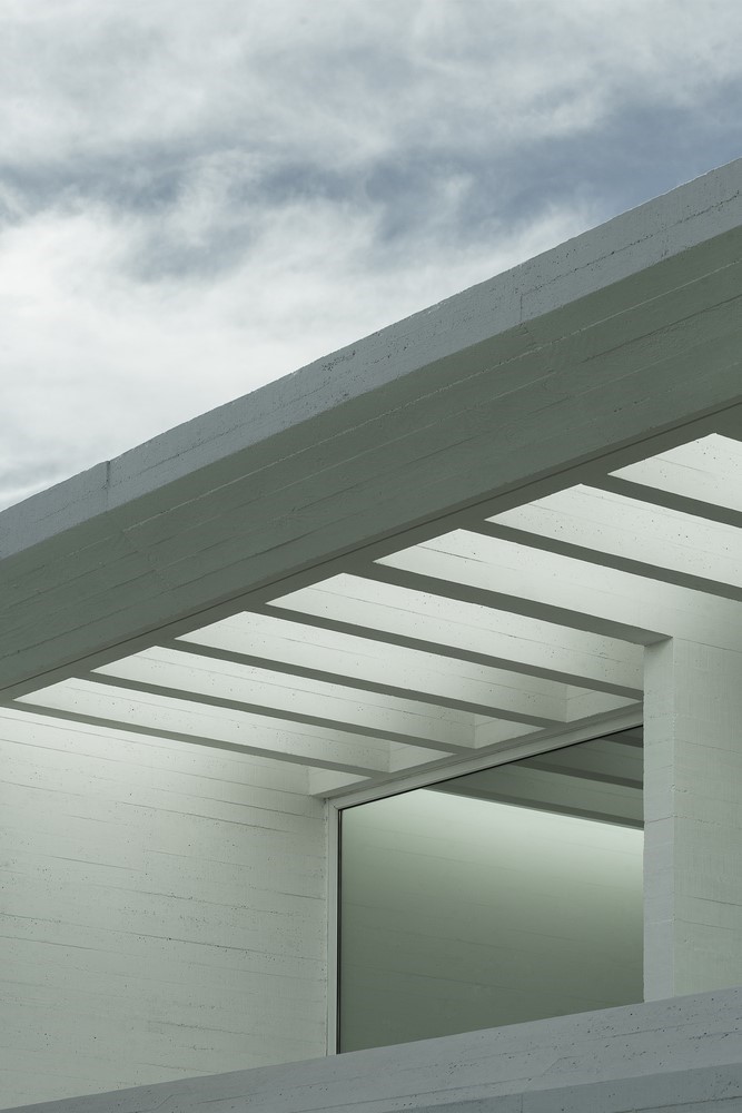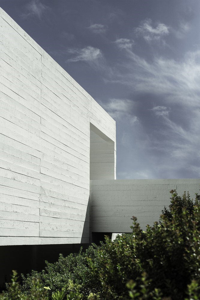 The material used for the construction of the house is reinforced concrete with board-formed finish. The purpose of this choice of material is to make the marks visible of the woodgrain when painting it white. This choice of color aims to further the effect of a luminous atmosphere that extends to each enclosure within the house, complemented with a series of skylights and light courtyards.