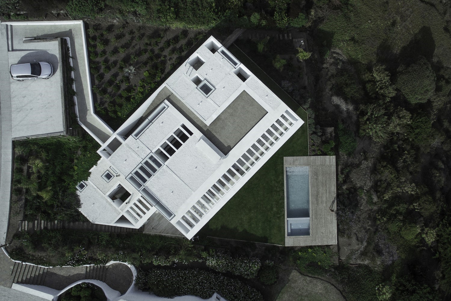 The AV house is located in a steep slope. It is an uneven terrain next to a gorge that looks to the south, and it does not face the sea at the east. In order to not miss this view and to protect it from the wind, the house was partially rotated facing east, offering direct visual access to the Pacific Ocean.