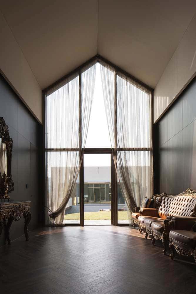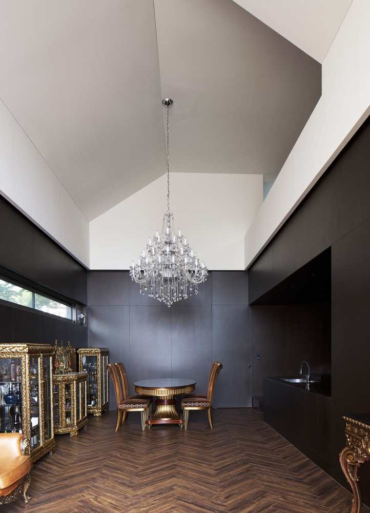 First floor’s common space was given high ceilings (6m), and dark color finishes were used for the furniture background so that the beautiful designs can be highlighted and notices. The shapes and sizes of the ceiling and living room windows coupled with the location of the long window of the front lawn are within context. The high and tall windows are meant for the two homes to look upon each other with ease. The windows in the kitchen and island kitchen allow for the mother to see the 4 seasons change as if it’s an art painting. A crystal chandelier overlooks the dining table in the first floor to add a classical touch and transition to the second floor. The second floor has an office for the father to overlook the lawn as well as guestrooms.