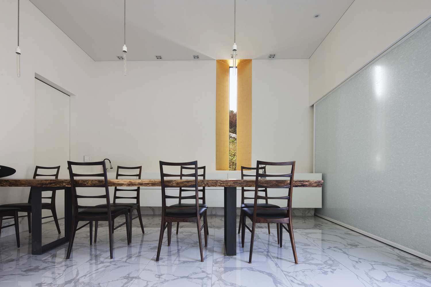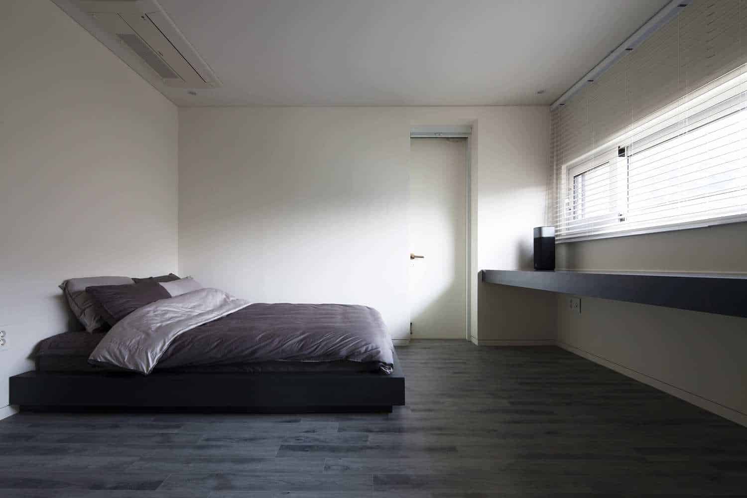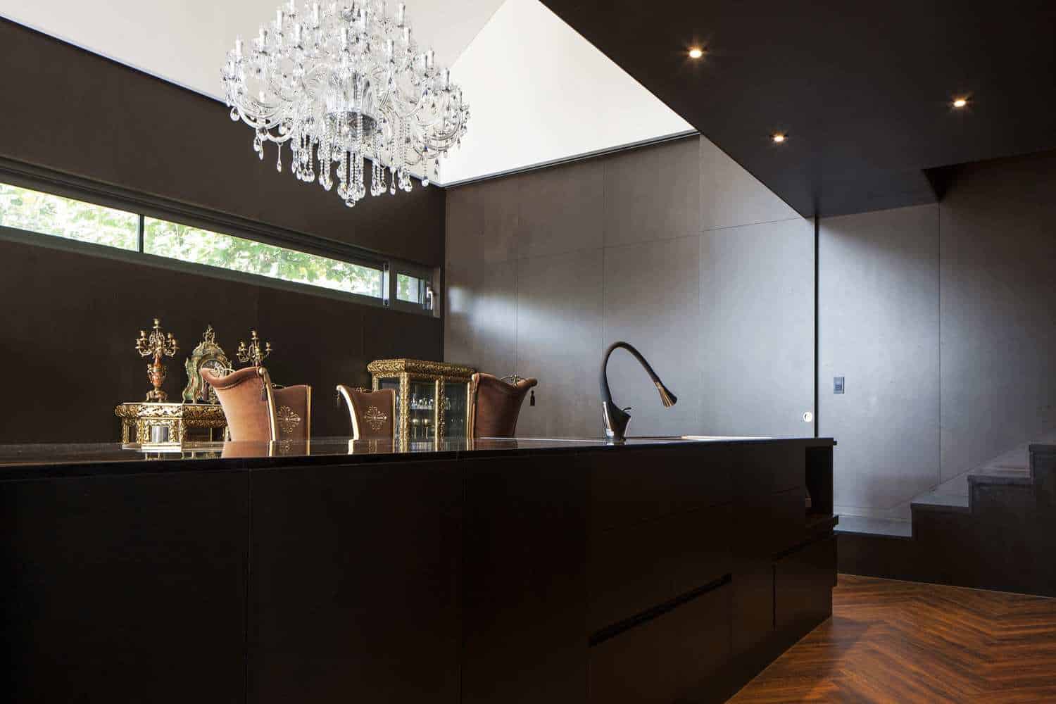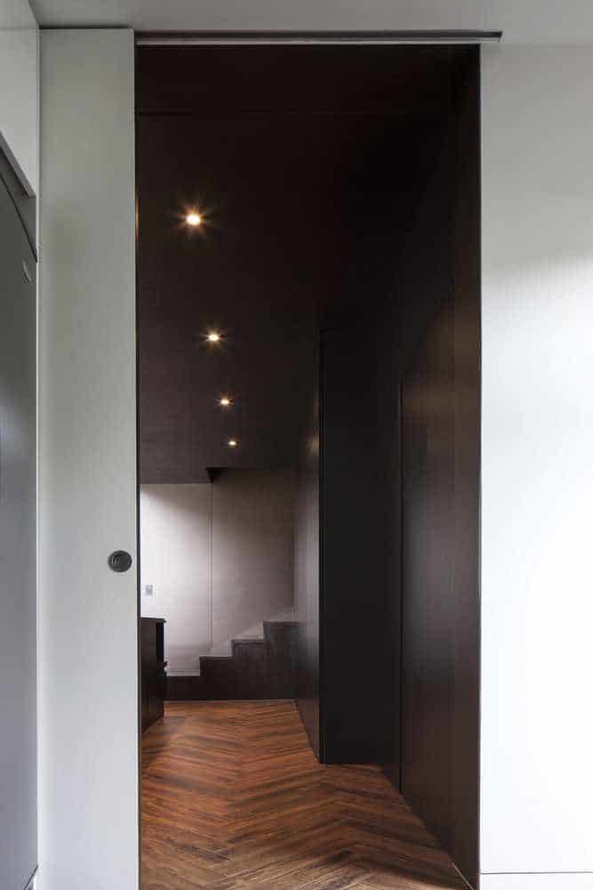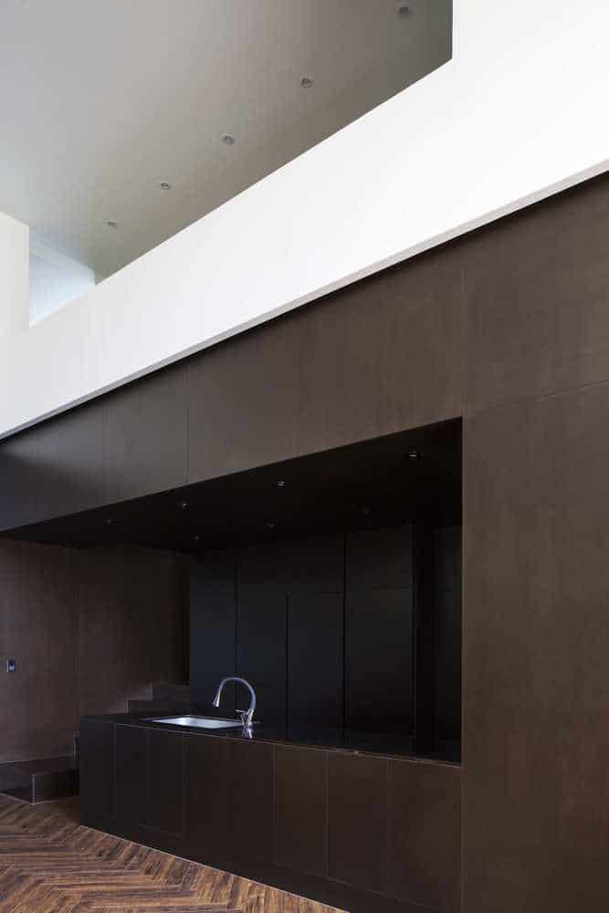 The residential owners live in all white living space. The living space is also minimalist, so there mustn’t be any clutter. With high ceilings (3.5m), long windows seen across a narrow kitchen, wall lighting in bedrooms, the space felt voluminous and open. The sight of their parents’ structure seen across the lawn out looking the front window, it was as if their parents’ house was another work of art seen from their house. A trapdoor for some privacy was places as well. Adjacent the inner part of the living room was a small room for a bed and closet, and an office for the mother in which gives entry to the bathroom and bedroom. Downstairs is another office in which the husband can use to study and be a big part of his everyday lifestyle.