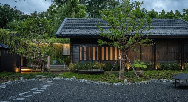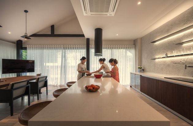 Meanwhile, the entirely black roof and façade act not just as visual signature, but as a material challenge: the studio worked with local artisans to paint nearly twenty thousand cement tiles black, enabling the home to absorb and transform light, emphasizing texture rather than surface brightness.