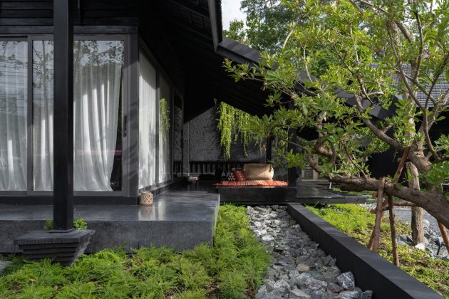 In a tropical, humid region with monsoon rains, shading, ventilation and resilience are central. Baan Dam responds on several levels: