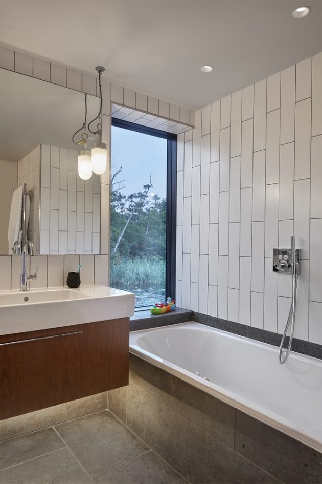 The Backwater house provided the opportunity to enhance the setting by establishing a stylish counterpoint to the neighboring houses which are more traditional in design. One of the key objectives of this design is to create simple, contemporary living spaces at the center of the house that can still benefit from stunning views of the surroundings.
