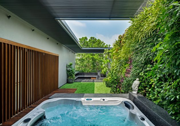 The Terrace – The terrace sequestered from the busy street is an area where the family entertains and unwinds. The home theatre room and the guest bedroom open into an open space with a Jacuzzi and open deck. The slatted roof and the raised green wall provide the required privacy to the space from the neighbors.