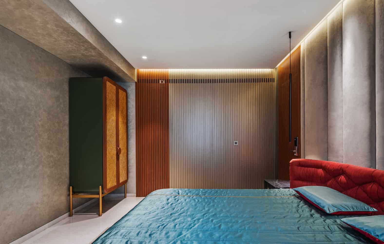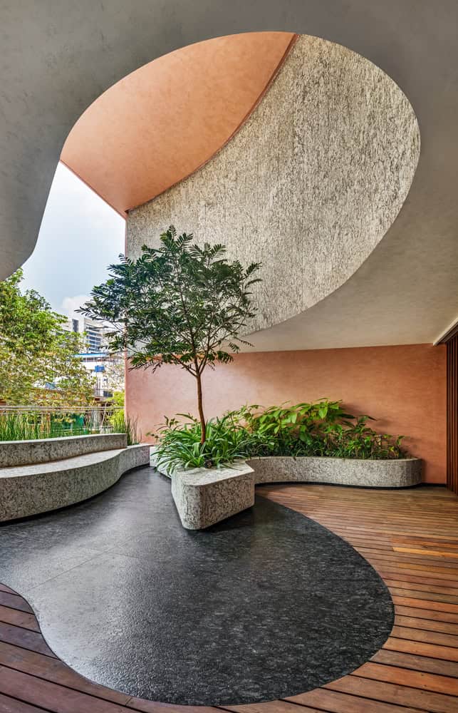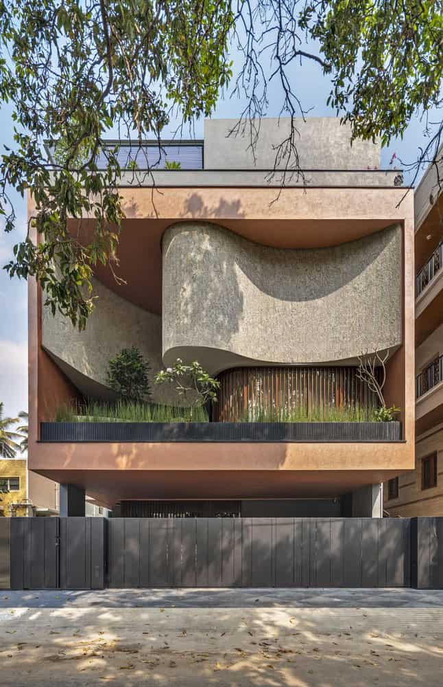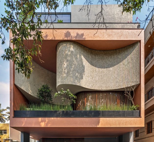 The Façade – The bold façade was conceptualized as an assemblage of different parts that come together to form a whole. The master bedroom is sculpted to create a figural void and is materially draped in rough marble. This ephemeral marble screen, structurally hung from the ceiling is bound by an earthy terracotta frame with a void. A garden occupies this void. The green deck with its figural void negotiates the connection between the interiors of the house and street it overlooks. The slatted window screen further adds a syncopated rhythm to this formal organisation.