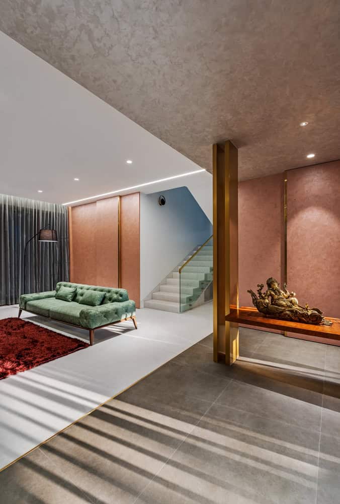 The Living room – The plan was organised around a double height space that forms the soul of the house. This space connects the living, dining, kitchen, prayer room and the exterior deck into a cohesive whole. The space is further animated with an internal balcony and a bridge overlooking it to establish connectivity with floor above. The fluidity in this space enables individual requirements to overlap with each other providing a cosy interactive space for the family. This space is rendered with an eclectic material palate, replete with colour and texture that seeks warmth and delight.