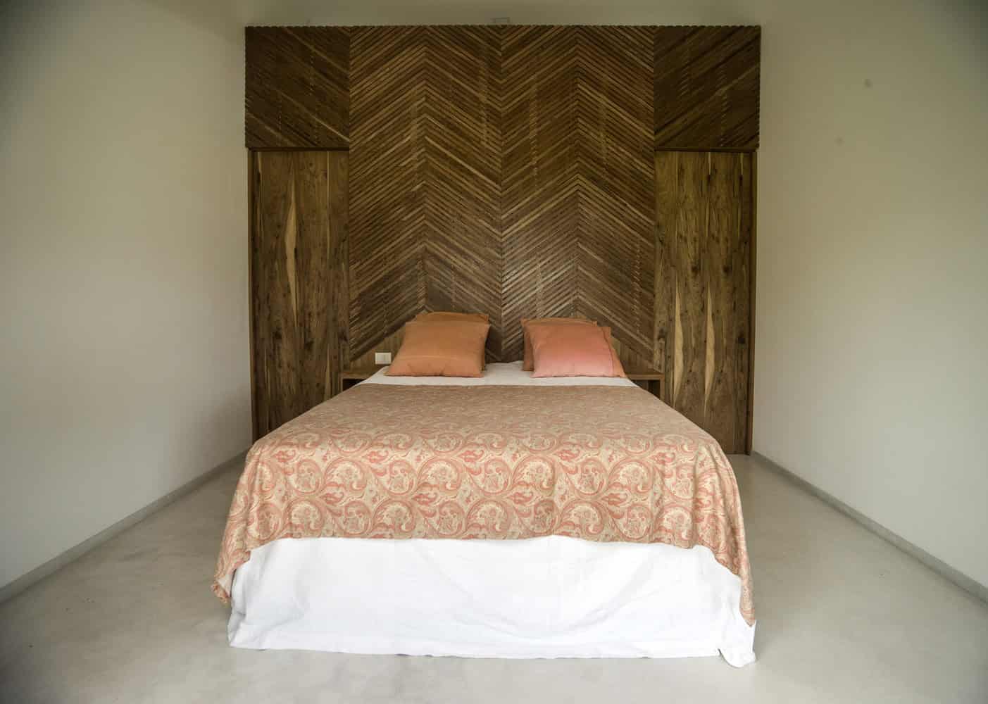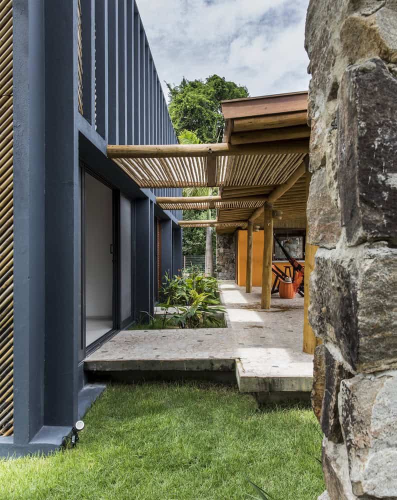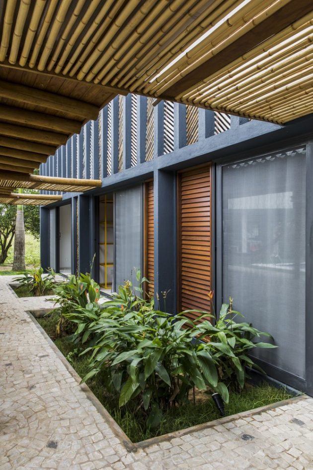 The volume of the bedrooms is built in structural masonry of concrete blocks, creating vertical ribs where bamboo sticks panels, arranged as fishbone, are placed in between. The bamboo panels shade the façade, helping the thermal behavior of the building.