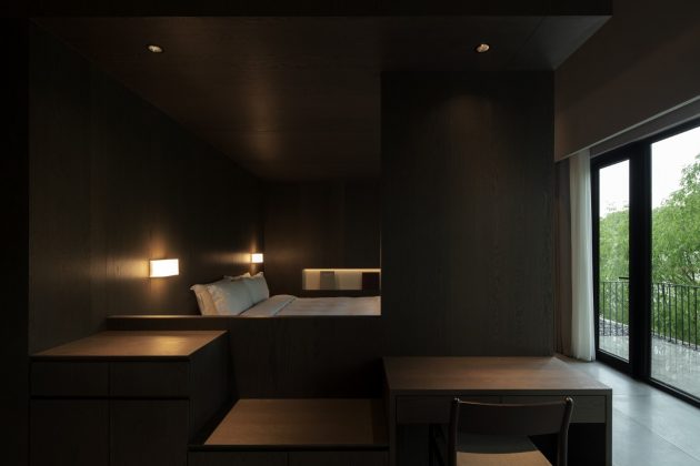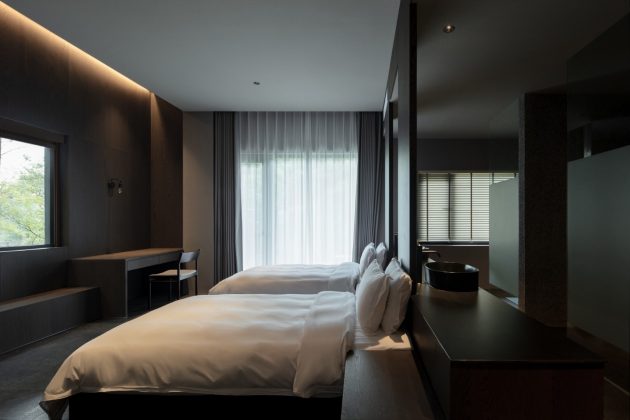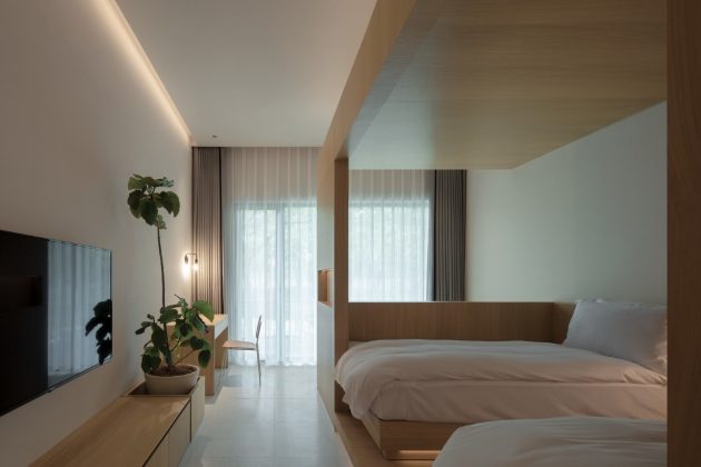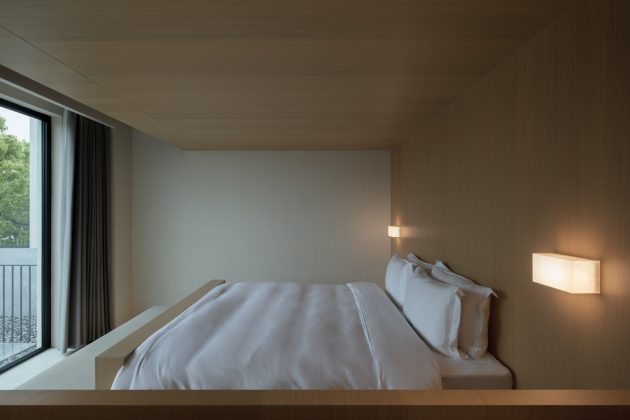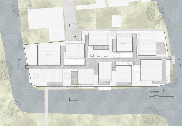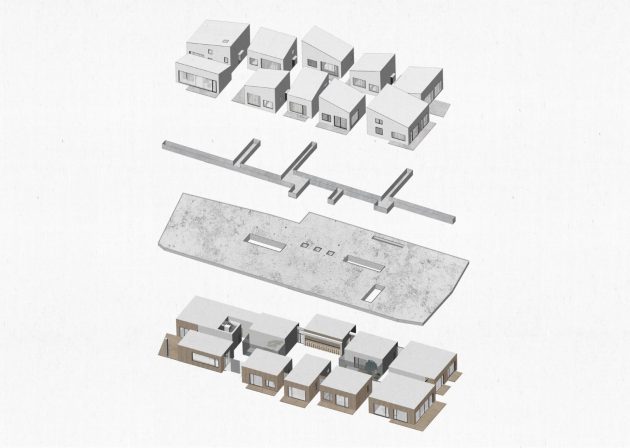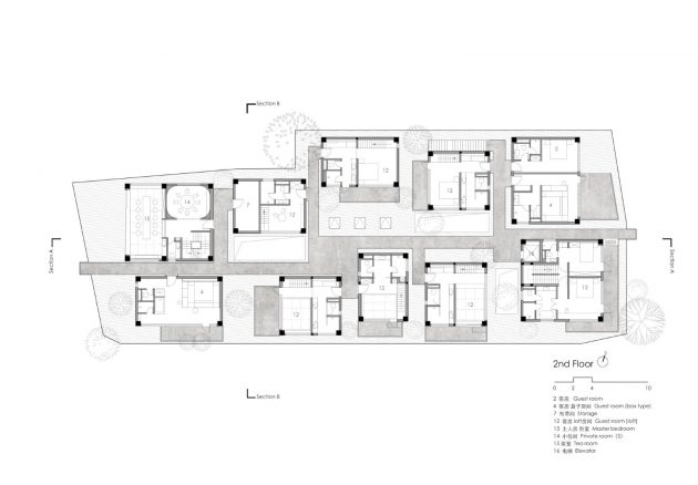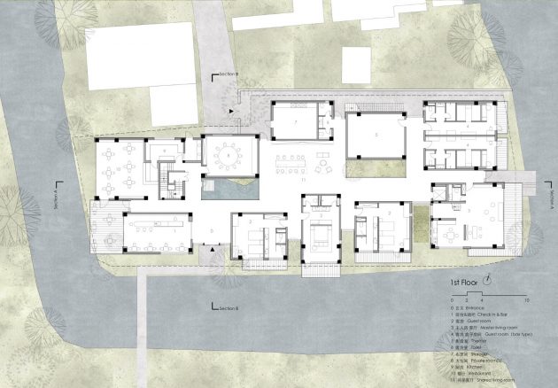 The program is divided into ten independent boxes, arranged along a continuous connective space. These volumes host a mix of public and private functions—restaurants, tearooms, guest rooms, and the owner’s residence—offering both intimacy and community under one roof.