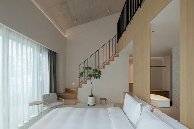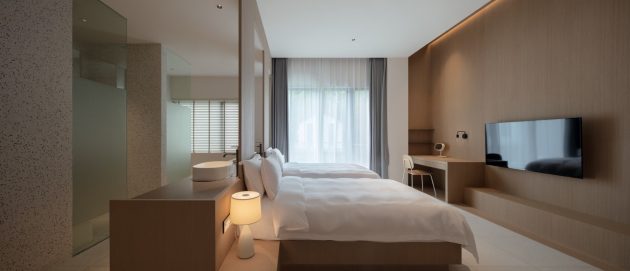 Interior Spaces: Off-white stucco walls, terrazzo floors, and natural wood furniture define the communal areas, providing a bright backdrop for exhibitions and gatherings. Guest rooms follow a consistent palette of stucco, terrazzo, and wood, accented with exposed aggregate concrete in shower areas for texture and slip resistance.