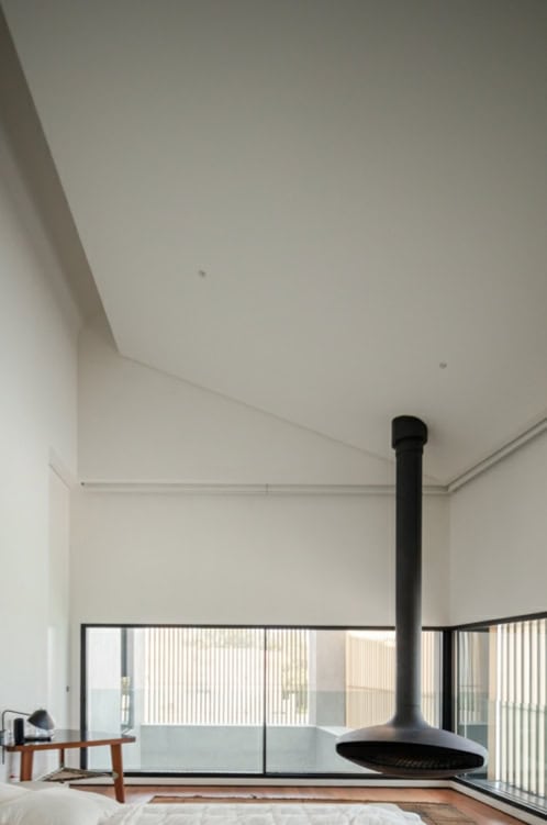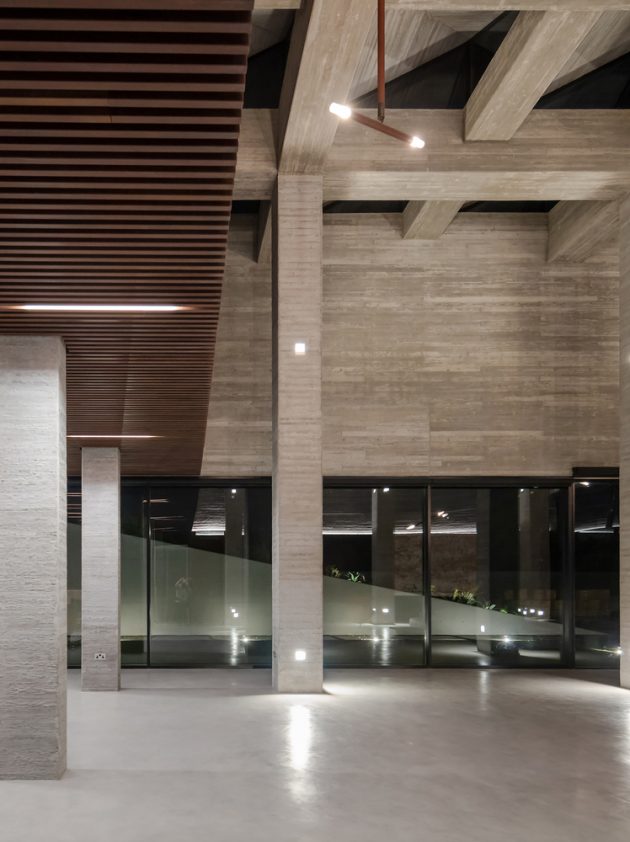 Access to upstairs is through a side service stair and a central one that is concealed within a central library, separating living from In/out TV room. The ‘guesthouse’, wedges between two landscapes, is connected to it at multiple levels: The living quarters (living, dining, open kitchen, and library have their façade) on the ground floor, the sleeping quarters (master suite, three en-suite guest bedrooms, a sitting area, and pantry) – via a courtyard alongside the guest bedrooms façade – on the first floor, and the clay studio via a roof garden. The geometric overlap between the 2 structures (guesthouse and barn) is a direct interpretation of a frequently required programmatic one; connecting the mum’s hosting area in the guest house to the kids’ playroom in the barn. This is achieved via a shortcut ‘secret corridor’ embedded within the wood cladded library snaking both structures.
