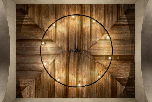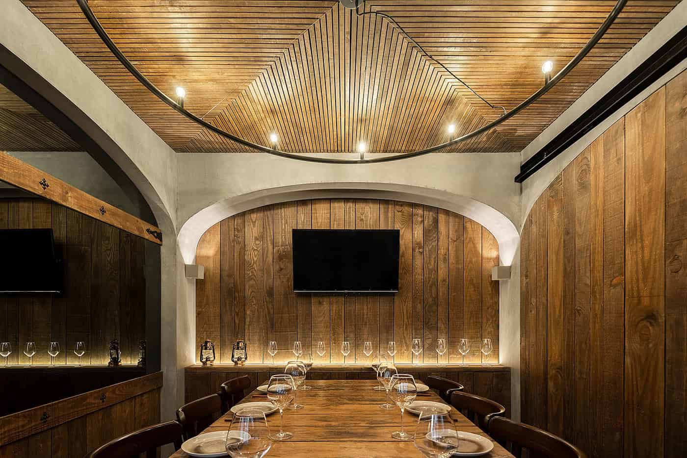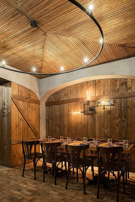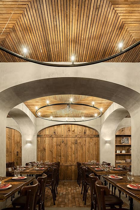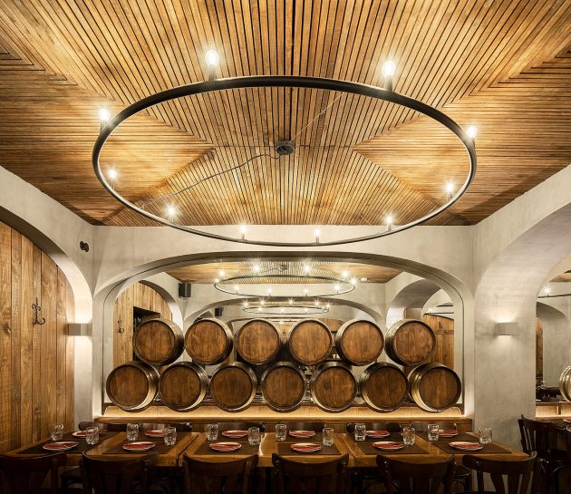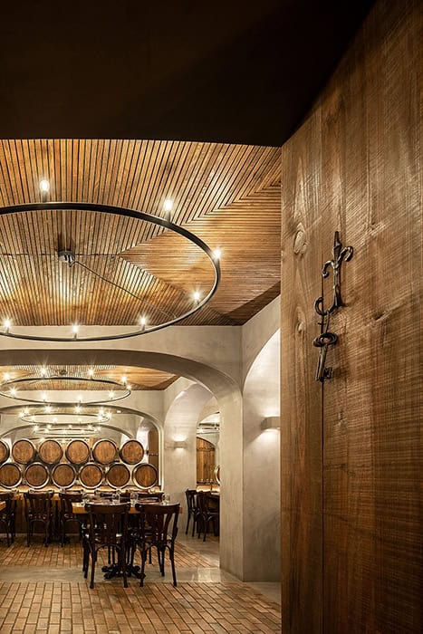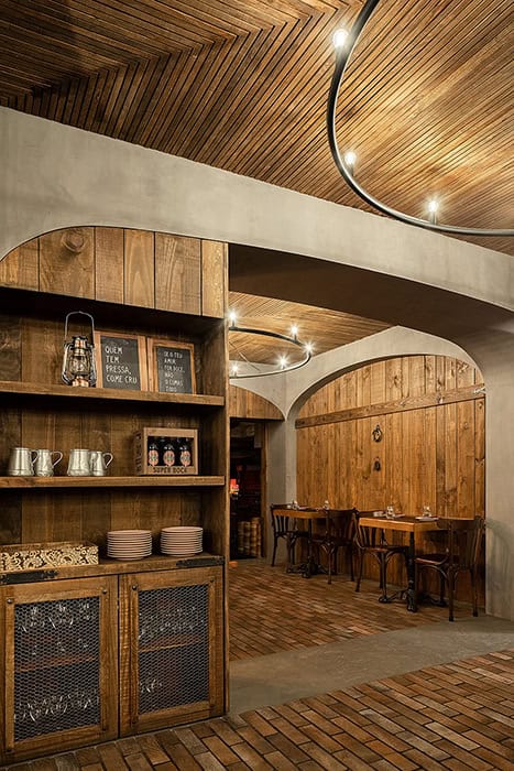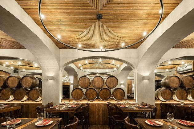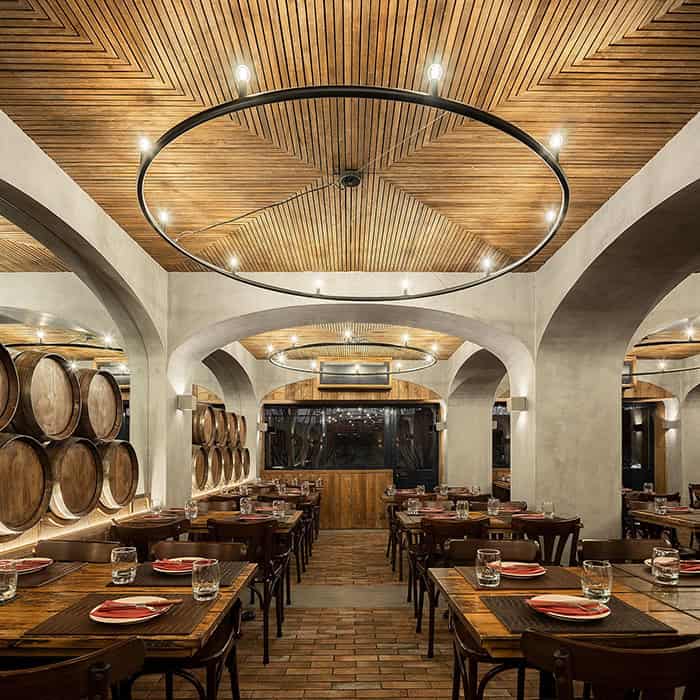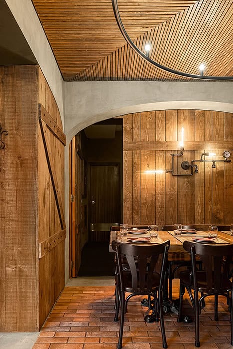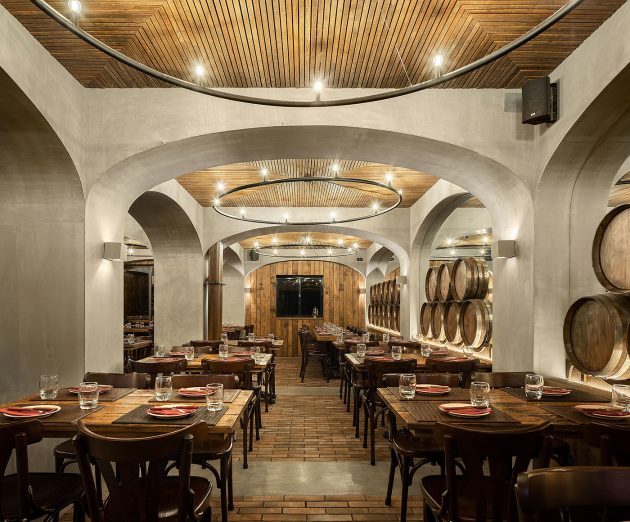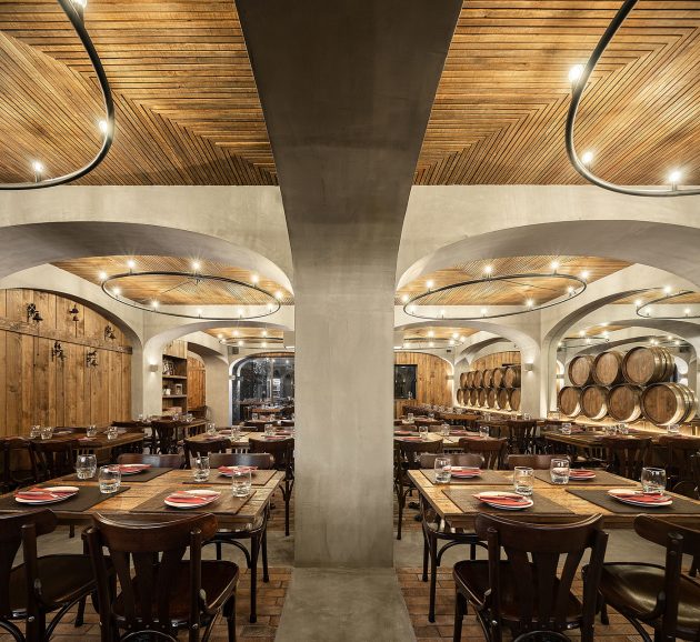 In order to reinforce the sensation of a winery, we opted for the use of textured materials and dark colors. These characteristics allow a greater spatial expression, by the expressive play between light and shadow, but above all help to solve one of the most common problems in successful restaurants, the excessive noise caused by the sound of reverberation. To solve this problem, knowing that sound works like a ping-pong ball, we designed a roof made of pine wood slats, with a color velvet finish, 20mm apart from each other, and on the top of these slatted panels we applied acoustic absorption material. With this little trick, we transformed the whole ceiling into a sound absorbing panel, managing to reduce the reverberation noise by over 80 %.