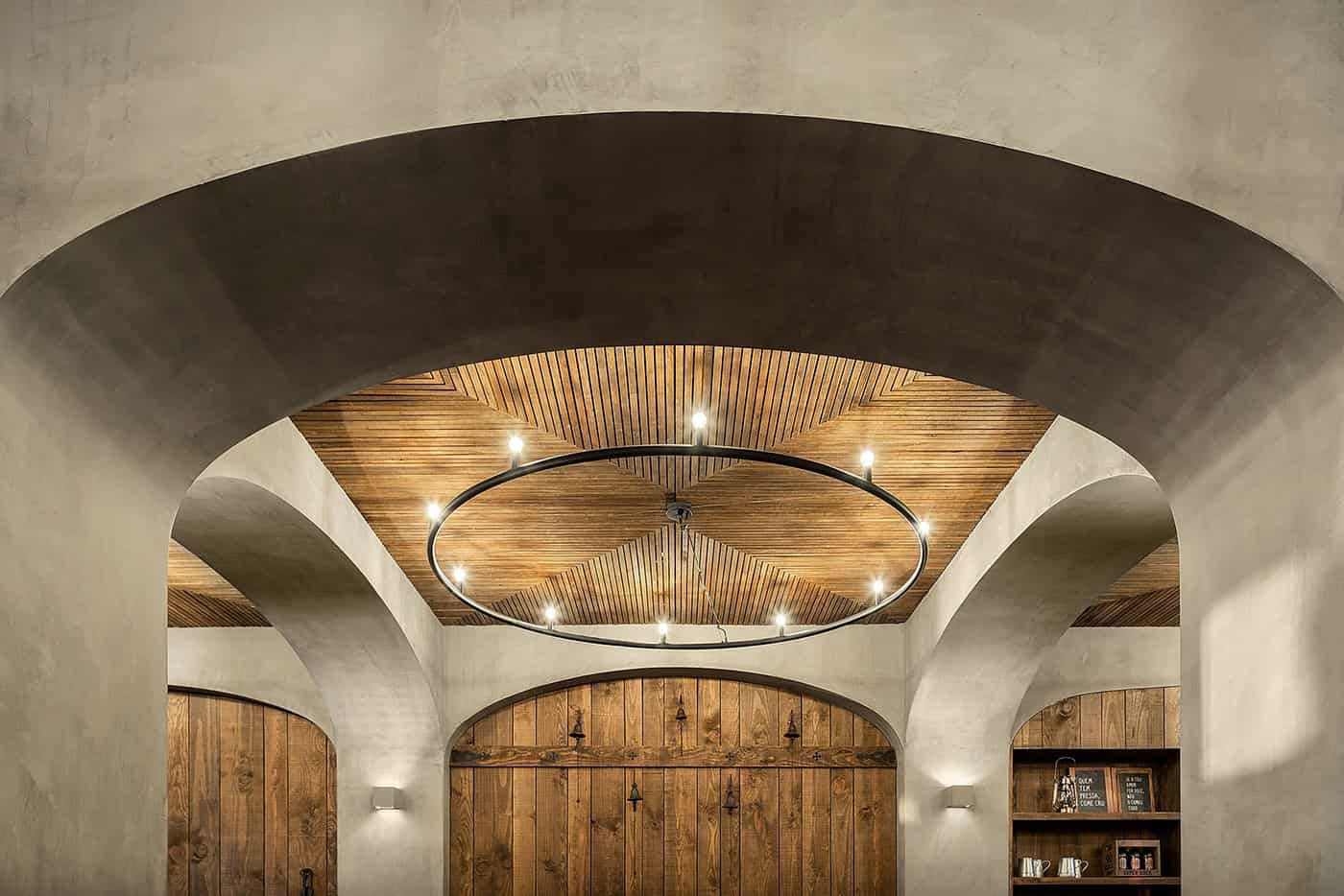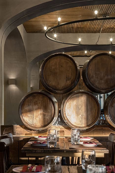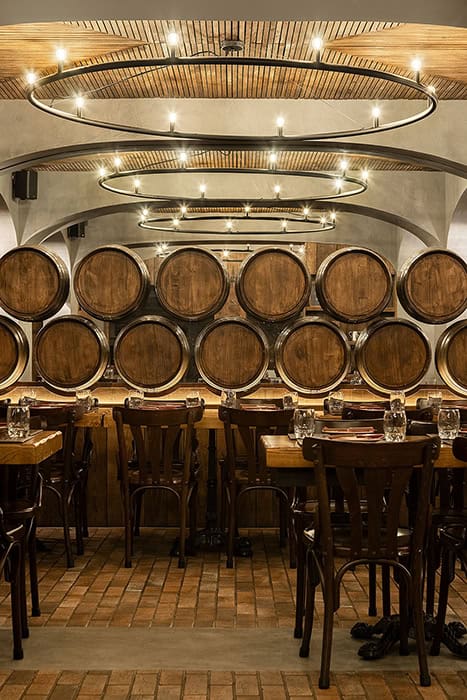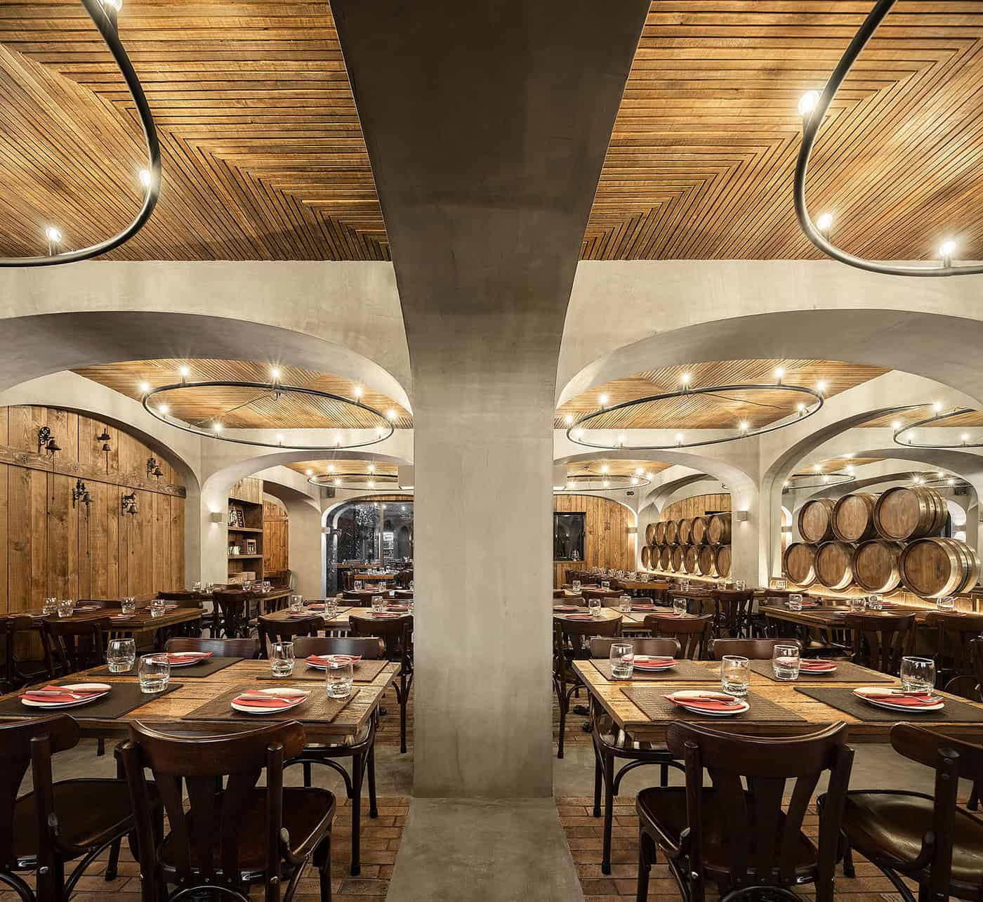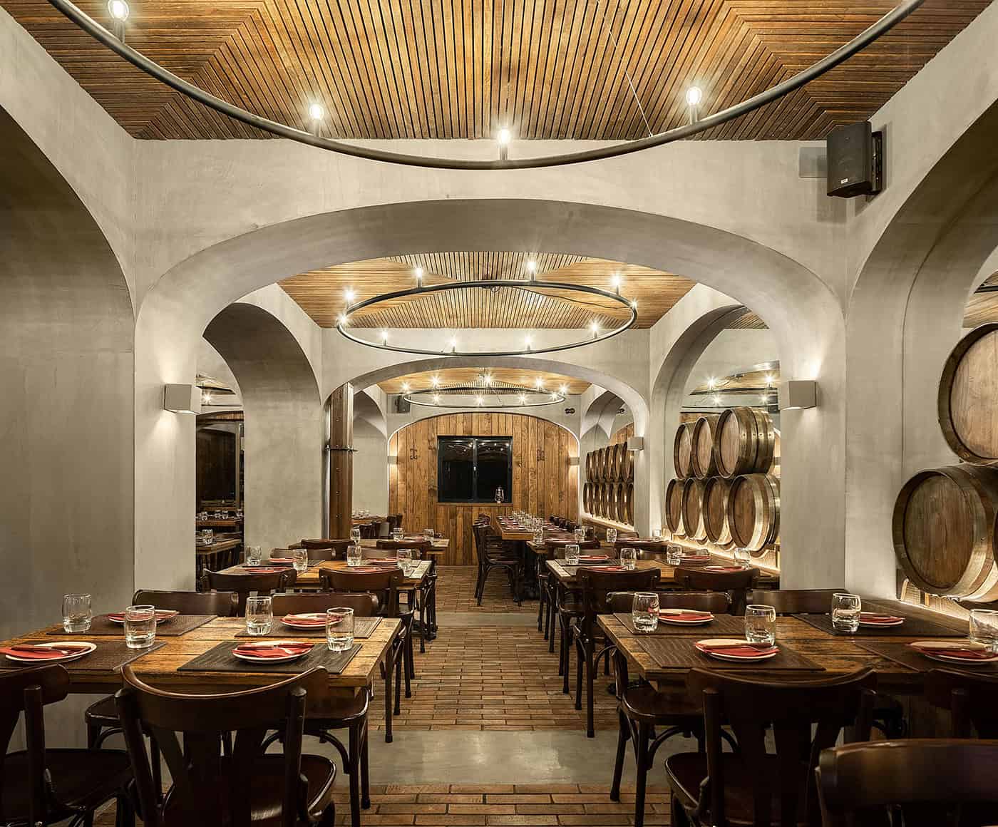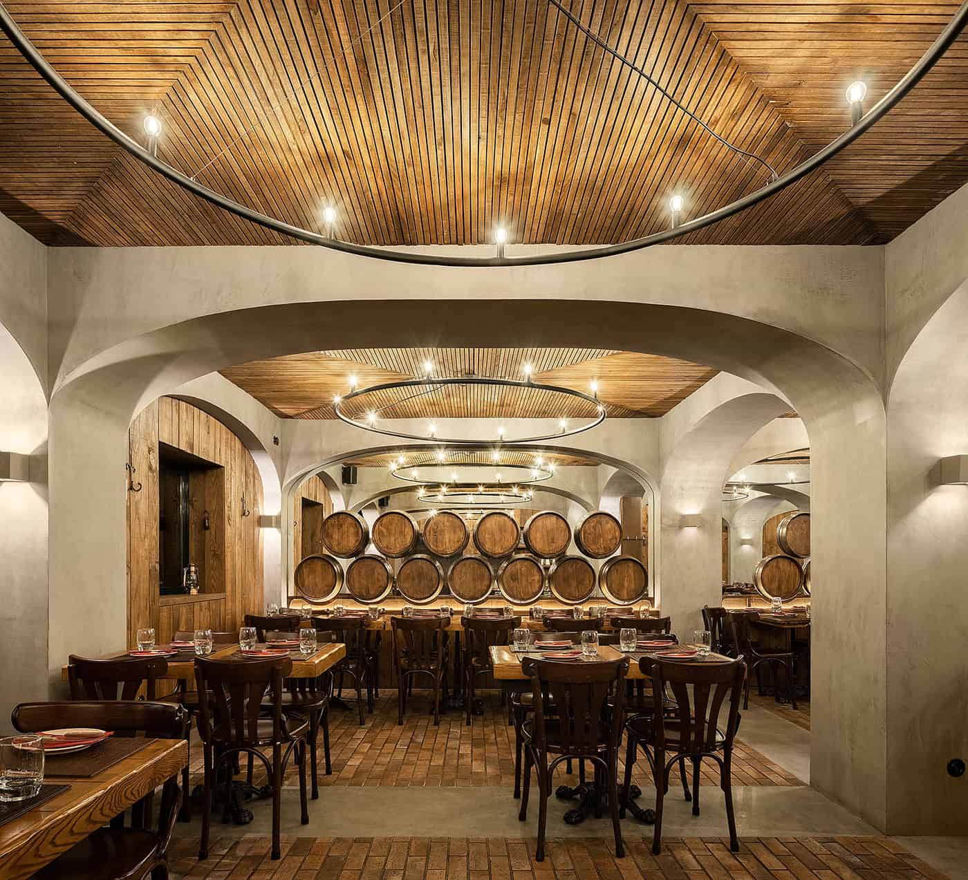 Rustic restaurant interior with wooden wine barrels, brick flooring, arched windows, and warm wood accents, showcasing cozy and stylish architecture design.