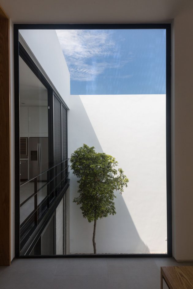 First courtyard is all about contemplation; from the bedrooms the experience is relaxing and inspiring, meanwhile from the kitchen and living room the leafy tree looks like a green veil. Second courtyard interconnects all secondary rooms allowing an intimate space among its users. Finally the third courtyard situated beside living room, honors social life and connects to flat roof which is the project’s leading and greatest space.