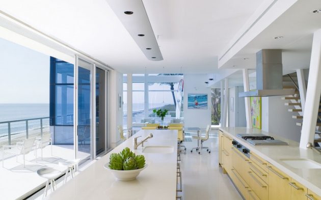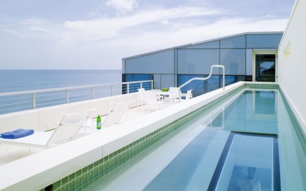 The amazing location imposed strict environmental restrictions on the shape of the building’s envelope on the site so the architects took the opportunity to place the home between an existing seawall and the state coastal control line.