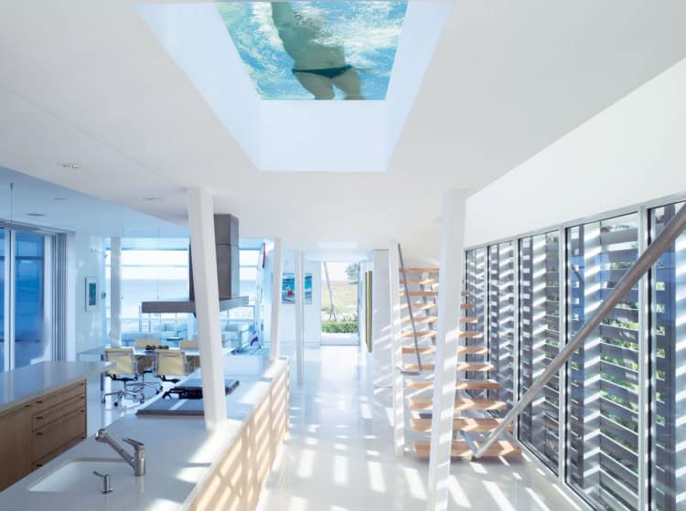 This nexus of glass and sand naturally begets a lively, if not theatrical, space—a stage for entertaining, food preparation and dining. Aluminum louvers below mediate the heat of the day, offering cool filtered light to the west. As evening advances, guests can wander to the rooftop lap pool to take in the views to the east and south. Whether viewed above or below, the compelling gesture of the pool provides a visual and visceral link to the thin wavering line of twilight at dusk, or the vast cerulean midday expanse. While modest, this rooftop “aquatic garden” augments the sense of space externally and internally, while functionally providing a dramatic, convenient and private space for an invigorating swim. During the day, the cool azure of the water is transmitted and transmuted into the living space through skylights embedded in the pool floor. The dynamic interplay of light and shadow invigorates the space below.