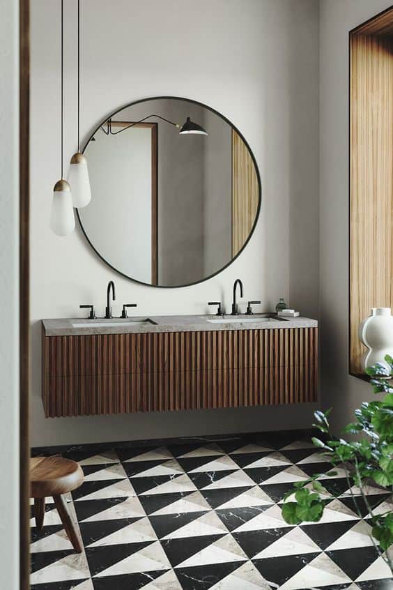 Objects can enter to give the space a modern feel! For example, some potted plants, the towels on display, the rug, a decorative tray, the organizing baskets, and so on.