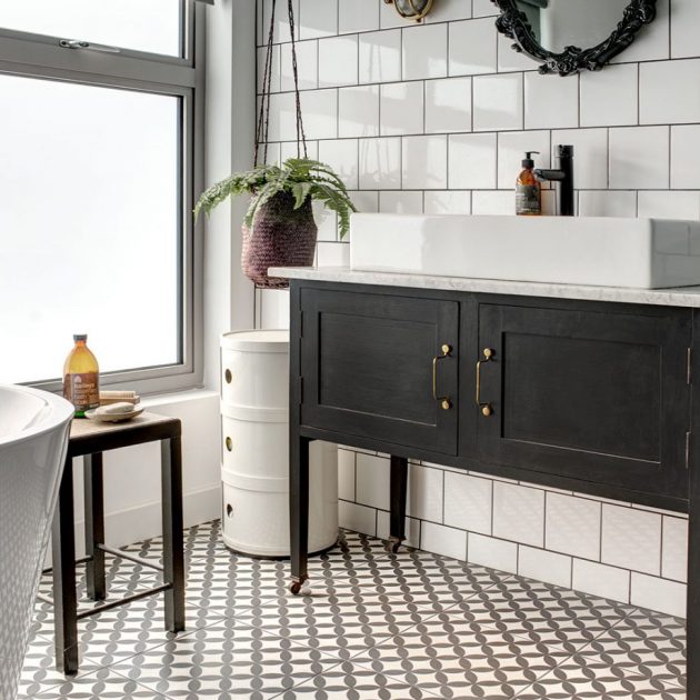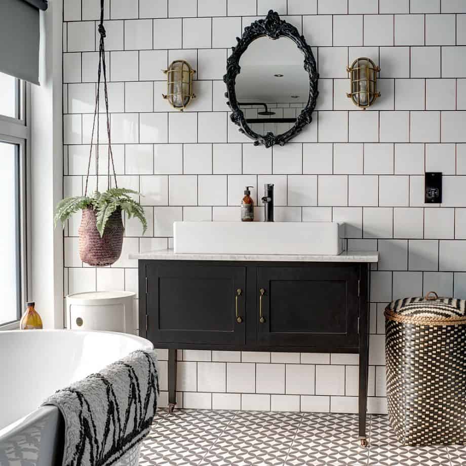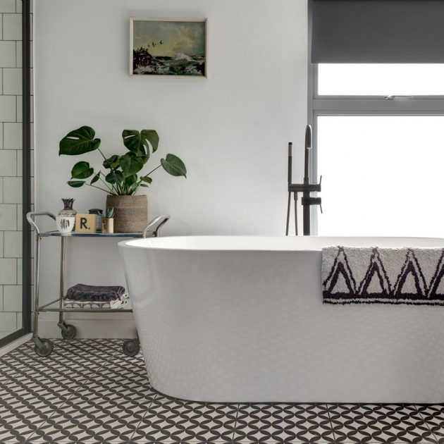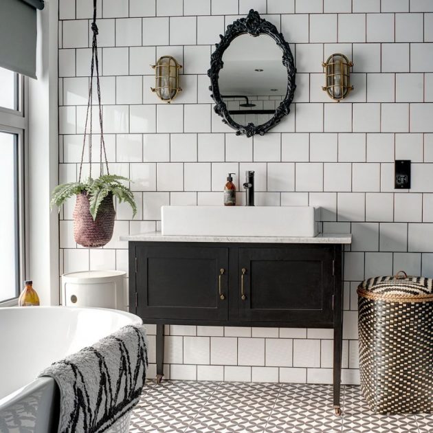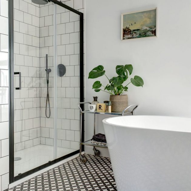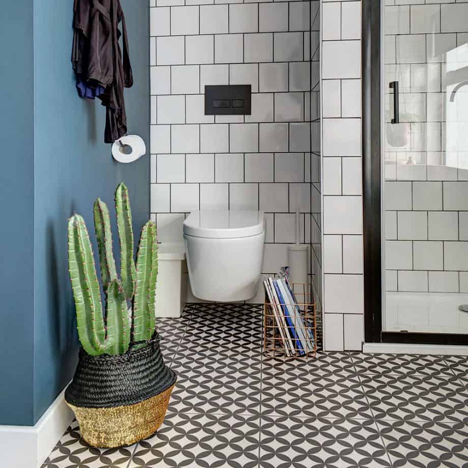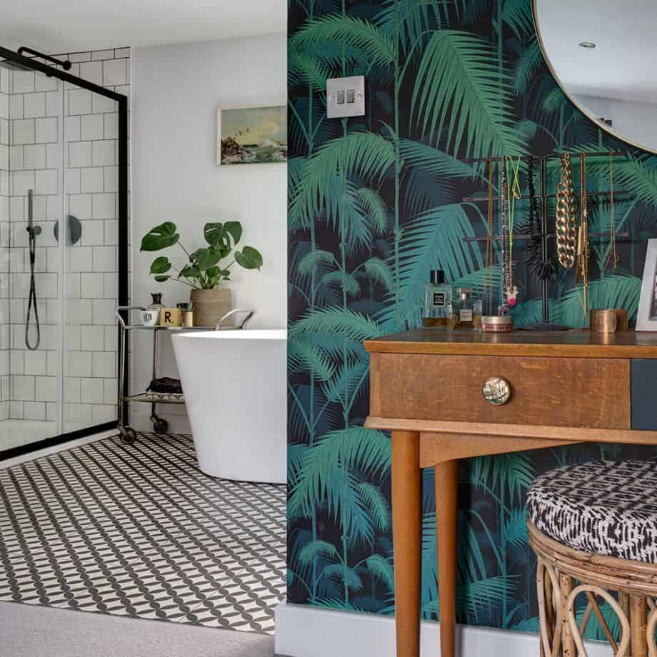The new en suite got his simple monochrome scheme which can evolve with different accessories and artwork. But, the palm print wallpaper gives the bedroom totally a different vibe, so calming for the senses, and everything in the bathroom was chosen to work alongside that. What about doors? No, they didn’t need even doors on the en suite because their room is so tucked away. Here, the catch is that the light flows between the rooms and you can be in the bath laying and watch the television in the bedroom. This couple really thought of every detail, ha! Now, the bathroom is their private retreat, a grown-up place to relax in. We put our trust in their hands!
