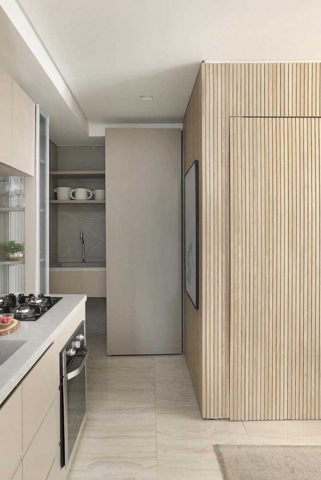 The beige porcelain tile in the kitchen brings spaciousness and enhances lighting, two very important things in this type of environment. In this space, the beige porcelain tile can be applied both on the floor and on the walls, with special emphasis on the backsplash of the sink.