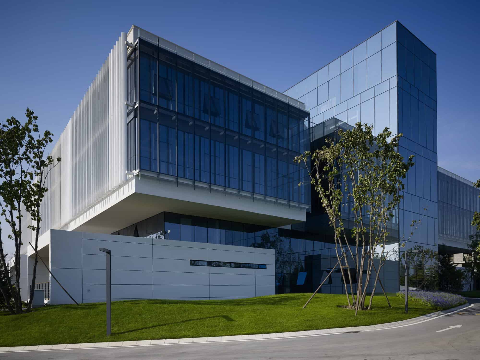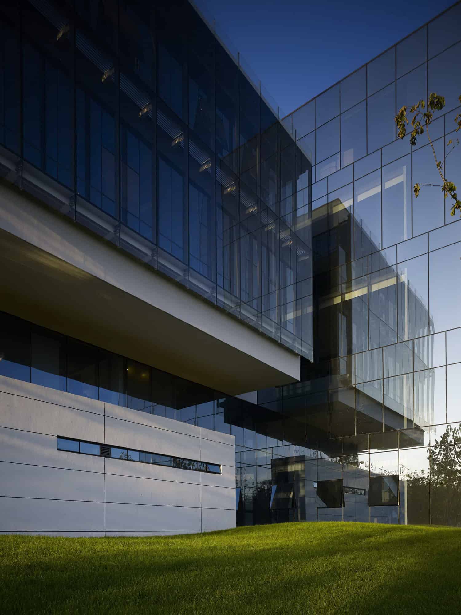 Futuristic modern glass office building with illuminated accents, surrounded by landscaped greenery and trees, showcasing innovative architecture and urban design.