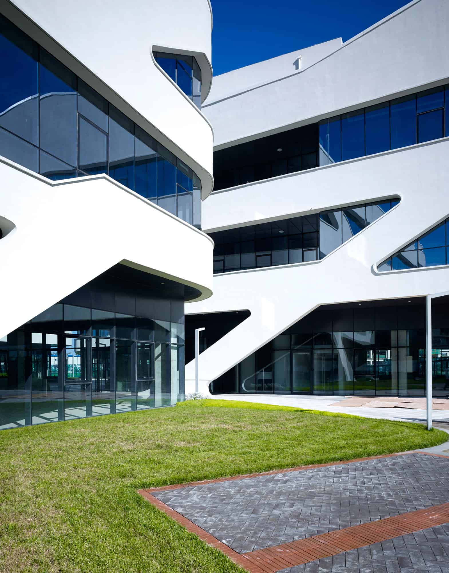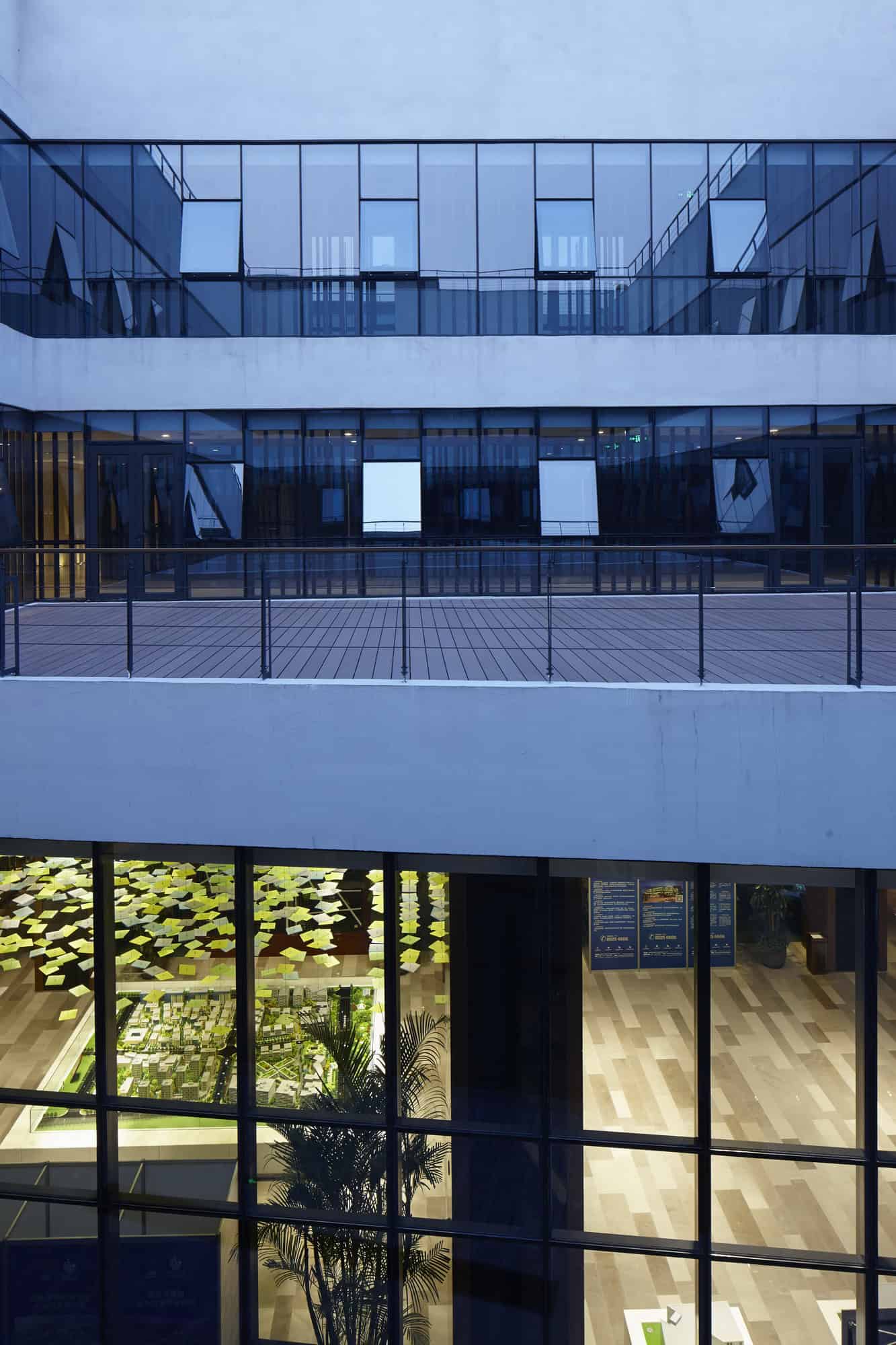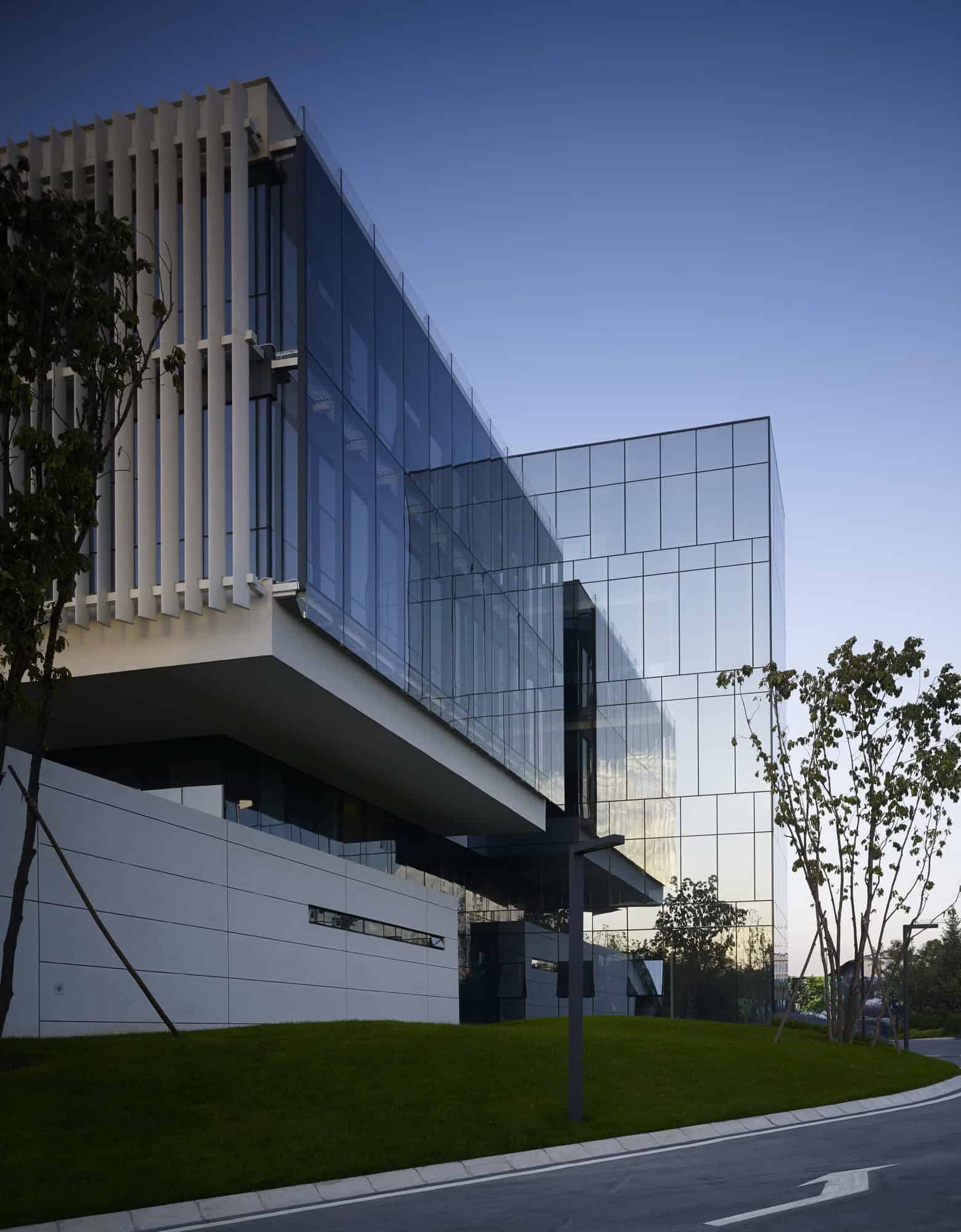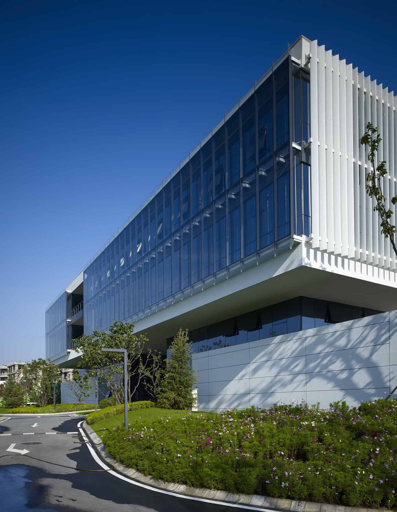 The construction area of the demonstration building is 11895m2, with 3 floors above ground and 1 underground floor. The office is a large-scale box, located on the second and third floors of the building. The first-floor space holds the office function in an orderly combination of eight functionally different small boxes, and the functions are organically combined through the atrium. Relying on the terrain, the building is connected to the surrounding environment through green slopes, making the building appear to be located above the park and become a green and energy-saving seed in the park. The grey space is combined with the atrium space, the terrace is combined with the roof garden, and the space is smart and exquisite. The white wall is lined with swaying trees and shines on sunny days. Respiratory curtains reflect the ever-changing light and shadow, showing different attractive colors in different days and times; the demonstration building consists of a number of independent functional unit boxes, each with its own personality.