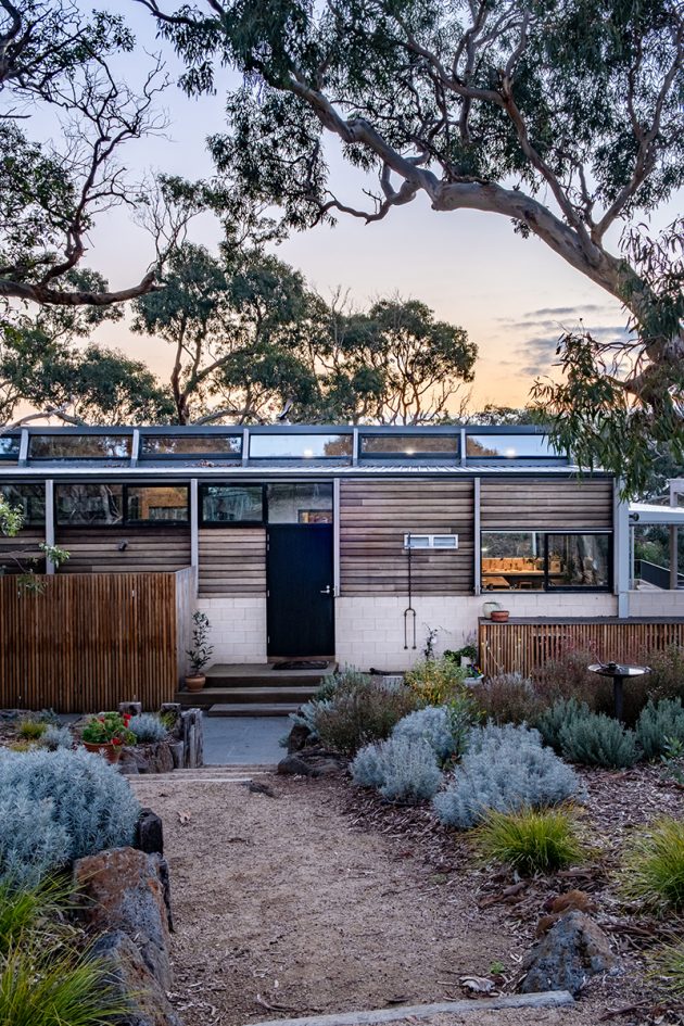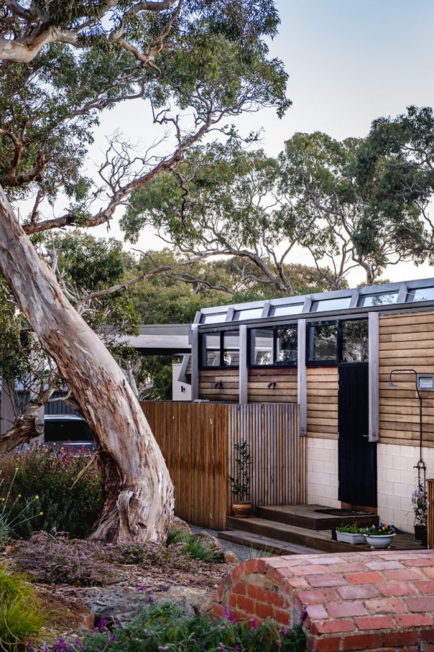 The natural landscape inspired the selection of exterior materials to complement the trees’ continuously changing ochres, greens and pearlescent soft grey bark. Laminated timber frames, ironbark cladding and steel framed glass symbiotically connect with the coastal environment to create a calm and harmonious composition.