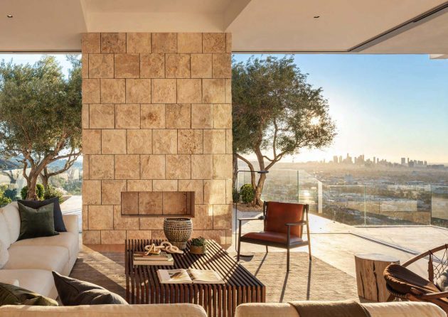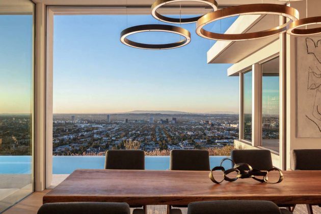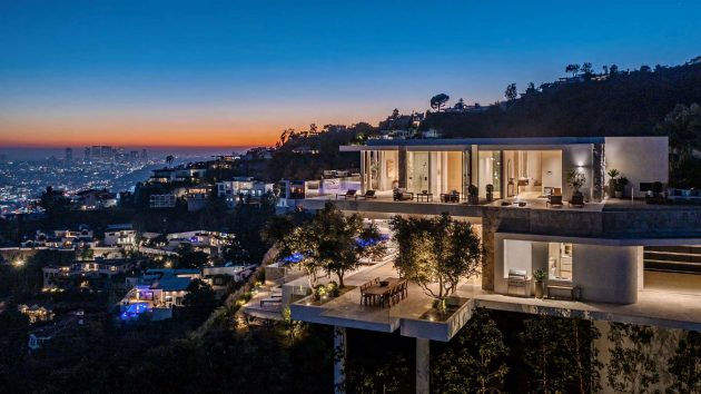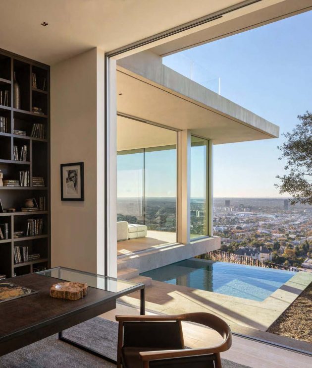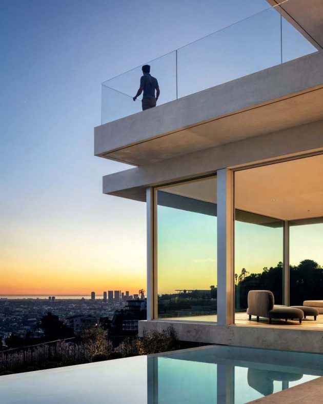 Strategically aligned with the north-south orientation of the city’s grid, the home rises on pillars and caissons to maximize its unobstructed views. Its layered horizontal planes—projecting boldly from the cliff’s edge—create dynamic terraces and cantilevered platforms that mirror the vast Los Angeles skyline.