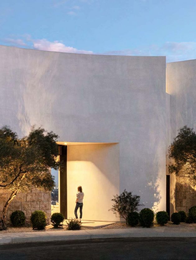 The architectural narrative flows from the intimate entrance—defined by curving, high walls—to the open, elevated spaces beyond. These sculptural walls frame the entrance while filtering sunlight through shadow-casting olive trees, balancing privacy with poetic lightplay.