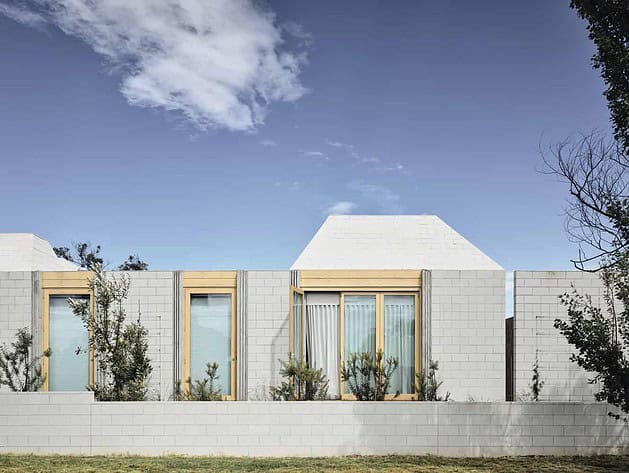 A single row of mature poplar trees, along the side unsealed road, forms a soft foreground to what we considered as the “main” façade of the house. Shadows of the trees cast onto the white concrete masonry blocks in the morning, animate the long articulated façade. The articulations, through the masonry and concrete detailing, together with the frustum roofs and layering of spaces, evoke street engagements and curiosities. These pose a polemic to the long façade which is essentially a defense mechanism to provide and suggest domestic privacy.