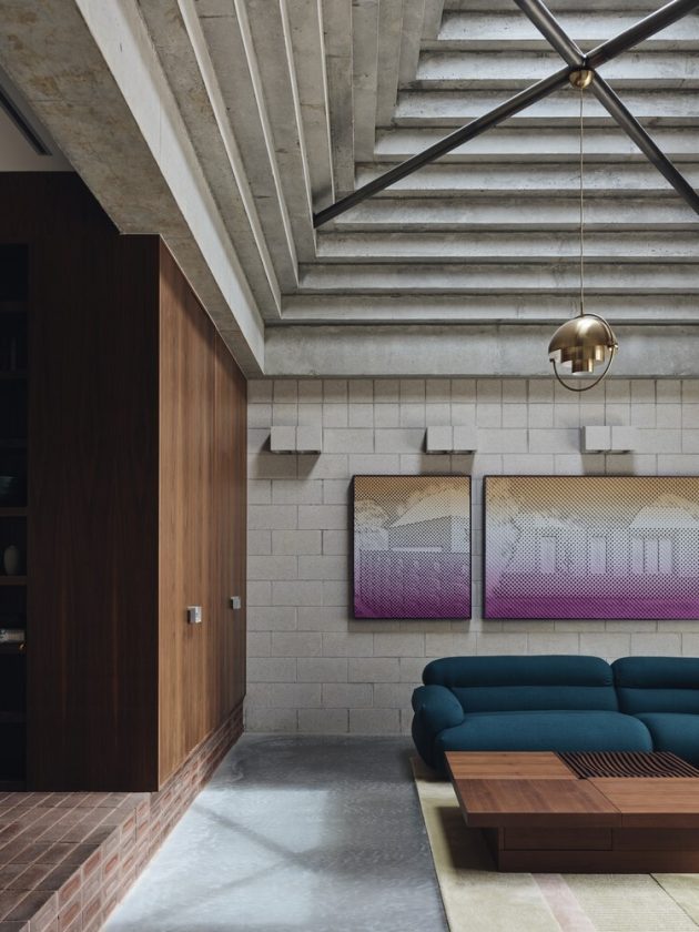 Once inside the house, the 2 largest of the frustum roofs reveal their internal structure: reverse step concrete pyramids. The skylight in the center of them provides all-day illumination to the living and dining areas. The heaviness of the structure makes the external masonry feel like eggshells, with complex engineering and detailing make the exteriors all the more minimal.