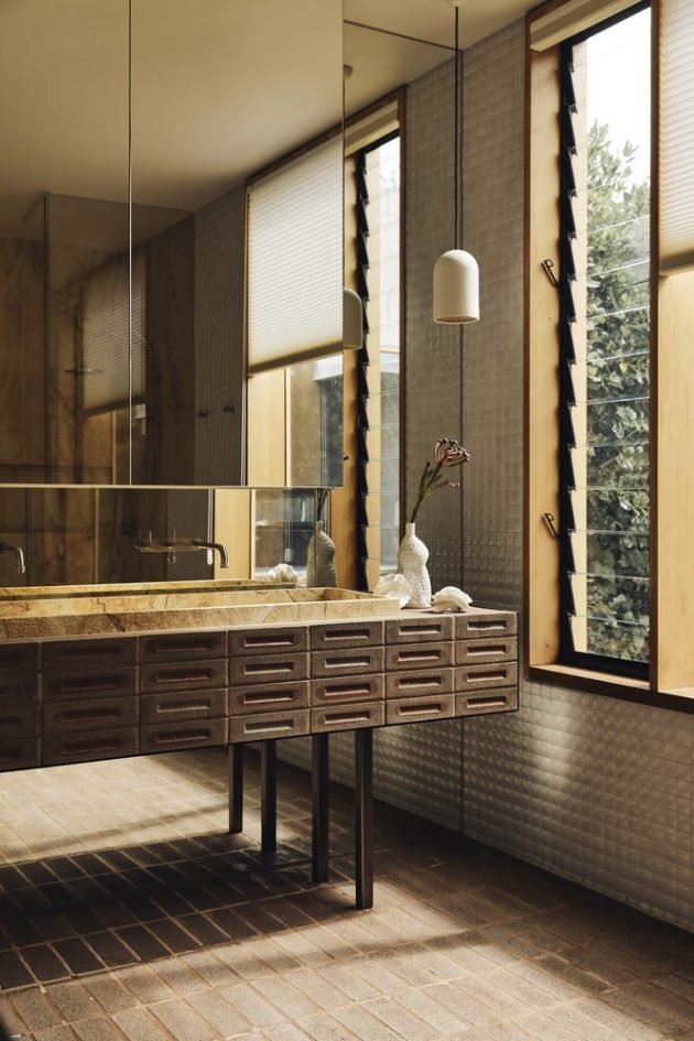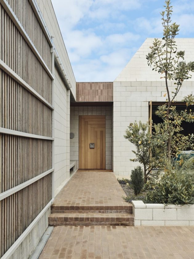 The formal entry sequence starts from entering the pedestrian gate on the main street: the dusty pink brick pavers provide the conduit between the native garden and the building structure. Through the gap between the long façade and the garage, an outdoor shower is provided for washing down the wet gears from the sea, before space opens up to the inner outdoor sanctum. Internal living spaces look into this north-facing courtyard garden where the family gathers and entertains.